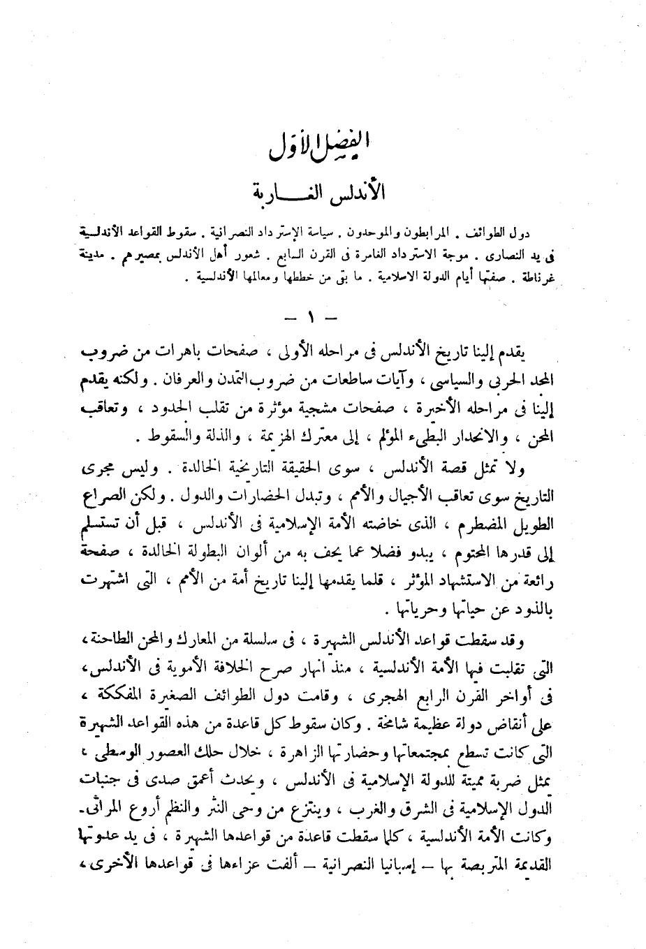 يقدم إلينا تاريخ الأندلس في مراحله الأولى، صفحات باهرات من ضروب المجد الحربى والسياسى، وآيات ساطعات من ضروب التمدن والعرفان. ولكنه يقدم إلينا في مراحله الأخيرة، صفحات مشجية مؤثرة من تقلب الجدود، وتعاقب المحن، والانحدار البطىء المؤلم، إلى معترك الهزيمة، والذلة والسقوط.