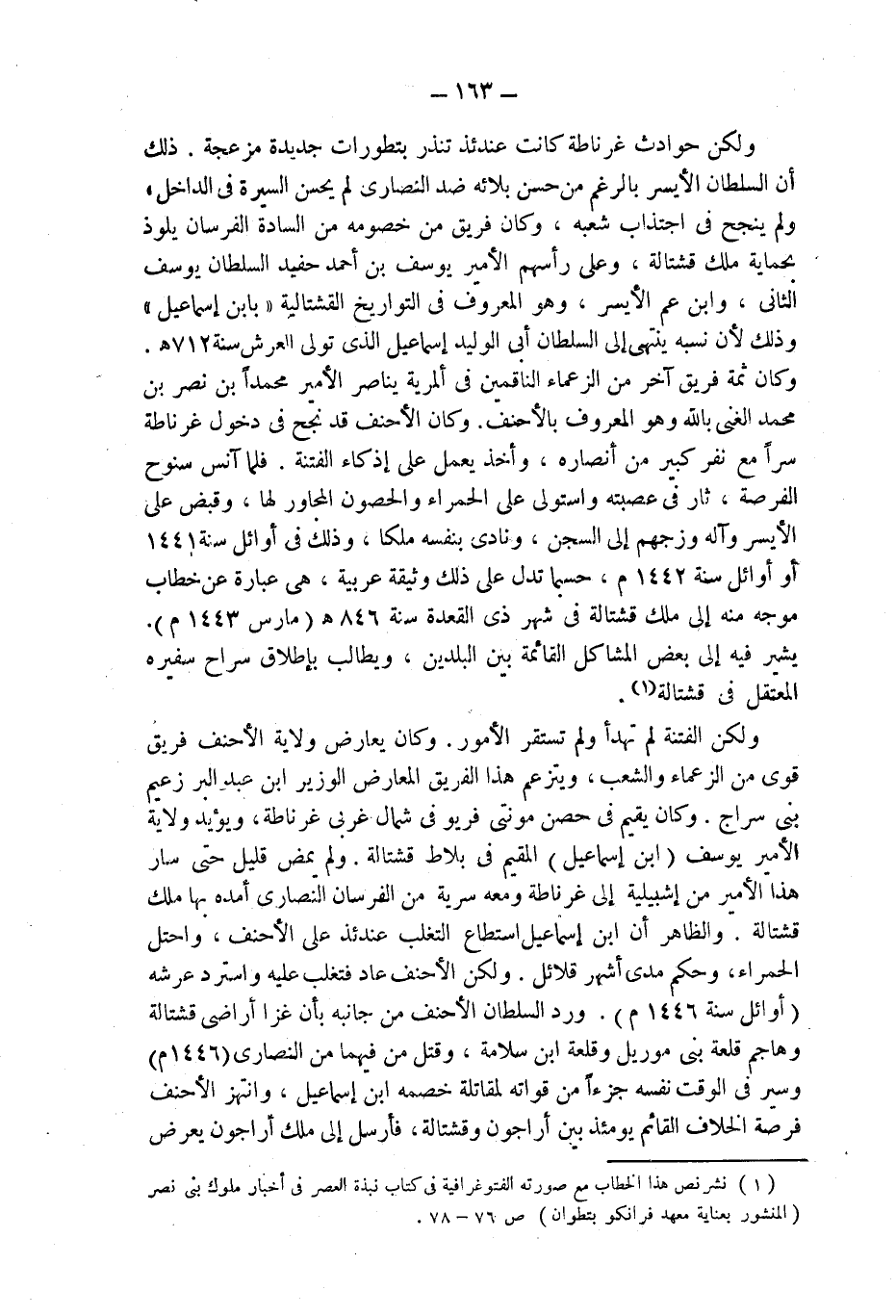 ولكن الفتنة لم تهدأ ولم تستقر الأمور. وكان يعارض ولاية الأحنف فريق قوى من الزعماء والشعب، ويتزعم هذا الفريق المعارض الوزير ابن عبد البر زعيم بنى سراج. وكان يقيم فى حصن مونتى فريو فى شمال غربى غرناطة، ويؤيد ولاية الأمير يوسف (ابن إسماعيل) المقيم فى بلاط قشتالة. ولم يمض قليل حتى سار هذا الأمير من إشبيلية إلى غرناطة ومعه سرية من الفرسان النصارى أمده بها ملك قشتالة. والظاهر أن ابن إسماعيل استطاع التغلب عندئذ على الأحنف، واحتل الحمراء، وحكم مدى أشهر قلائل. ولكن الأحنف عاد فتغلب عليه واسترد عرشه (أوائل سنة 1446 م). ورد السلطان الأحنف من جانبه بأن غزا أراضى قشتالة وهاجم قلعة بنى موريل وقلعة ابن سلامة، وقتل من فيهما من النصارى (1446 م) وسير الوقت نفسه جزءاً من قواته لمقاتلة خصمه ابن إسماعيل، وانتهز الأحنف فرصة الخلاف القائم يومئذ بين أراجون وقشتالة، فأرسل إلى ملك أراجون يعرض
