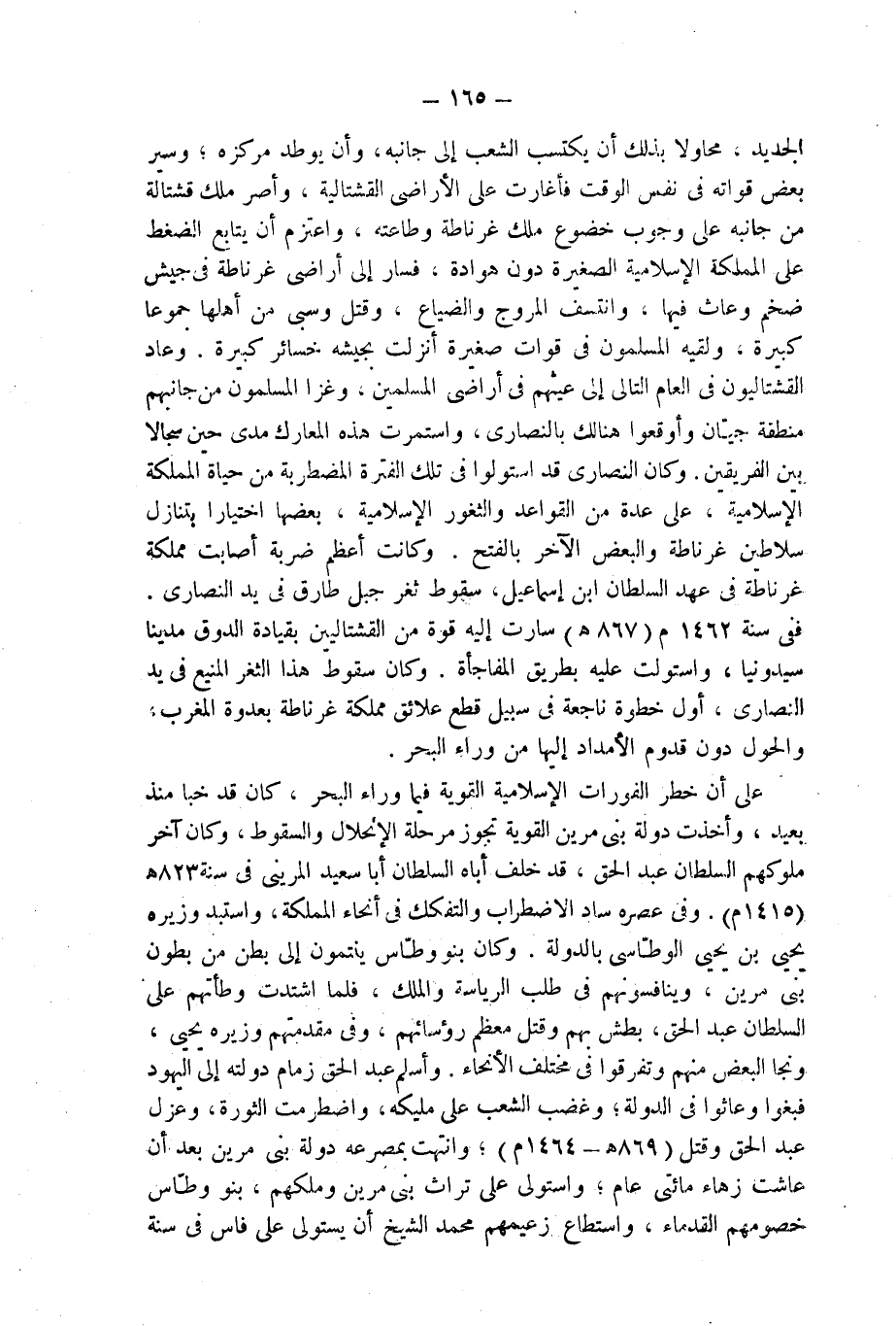 الجديد، محاولا بذلك أن يكتسب الشعب إلى جانبه، وأن يوطد مركزه؛ وسير بعض قواته فى نفس الوقت فأغارت على الأراضى القشتالية، وأصر ملك قشتالة من جانبه على وجوب خضوع ملك غرناطة وطاعته، واعتزم أن يتابع الضغط على المملكة الإسلامية الصغيرة دون هوادة، فسار إلى أراضى غرناطة فى جيش ضخم وعاث فيها، وانتسف المروج والضياع، وقتل وسبى من أهلها جموعا كبيرة، ولقيه المسلمون فى قوات صغيرة أنزلت بجيشه خسائر كبيرة. وعاد القشتاليون فى العام التالى إلى عيثهم فى أراضى المسلمين، وغزا المسلمون من جانبهم منطقة جيّان وأوقعوا هنالك بالنصارى، واستمرت هذه المعارك كدى حين سجالا بين الفريقين. وكان النصارى قد استولوا فى تلك الفترة المضطربة من حياة المملكة الإسلامية، على عدة من القواعد والثغور الإسلامية، بعضها اختيارا بتنازل سلاطين غرناطة والبعض الآخر بالفتح. وكانت أعظم ضربة أصابت مملكة غرناطة فى عهد السلطان ابن إسماعيل، سقوط ثغر جبل طارق فى يد النصارى. ففى سنة 1462 م (867 هـ) سارت إليه قوة من القشتاليين بقيادة الدوق مدينا سيدونيا، واستولت عليه بطريق المفاجأة. وكان سقوط هذا الثغر المنيع فى يد النصارى، أول خطوة ناجعة فى سبيل قطع علائق مملكة غرناطة بعدوة المغرب، والحول دون قدوم الأمداد إليها من وراء البحر.
