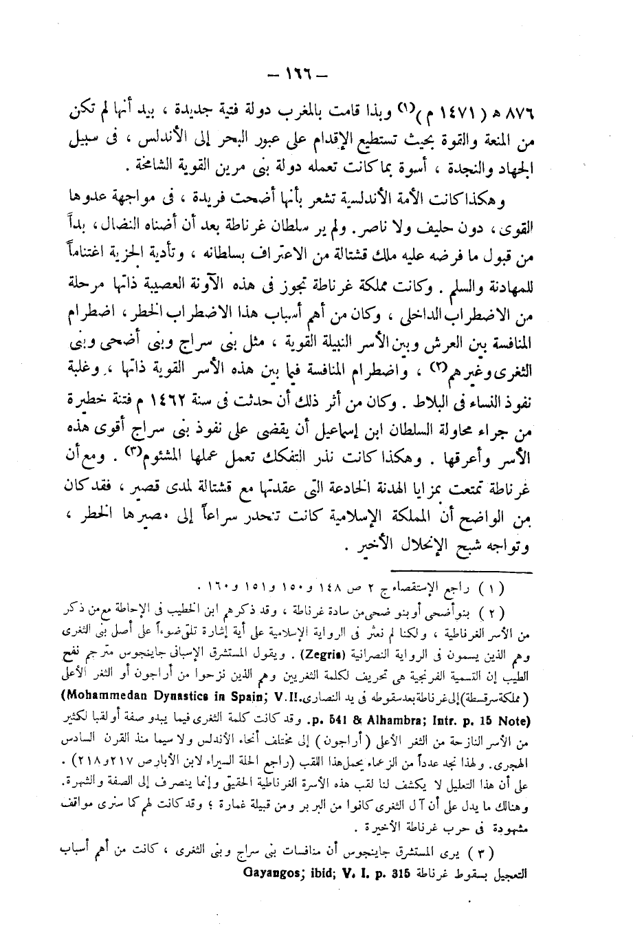 (¬3) يرى المستشرق جاينجوس أن منافسات بنى سراج وبنى الثغرى، كانت من أهم أسباب التعجيل بسقوط غرناطة Gayangos ; ibid; V. I. p. 315