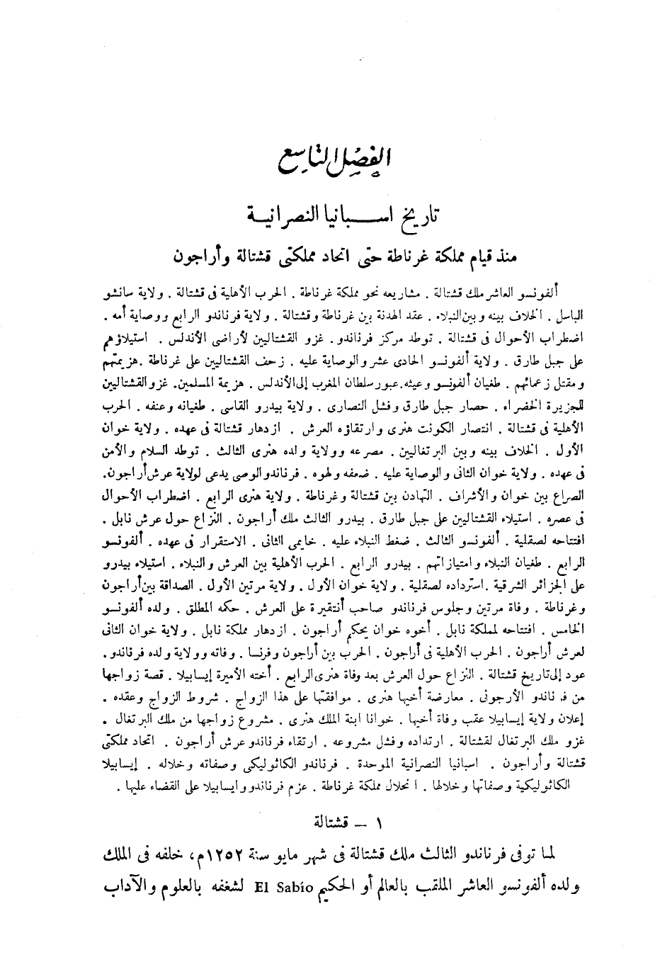ألفونسو العاشر ملك قشتالة. مشاريعه نحو مملكة غرناطة. الحرب الأهلية فى قشتالة. ولاية سانشو الباسل. الخلاف بينه وبين النبلاء. عقد الهدنة بين غرناطة وقشتالة. ولاية فرناندو الرابع ووصاية أمه. اضطراب الأحوال فى قشتالة. توطد مركز فرناندو. غزو القشتاليين لأراضى الأندلس. استيلاؤهم على جبل طارق. ولاية ألفونسو الحادى عشر والوصاية عليه. زحف القشتاليين على غرناطة. هزيمتهم ومقتل زعمائهم. طغيان ألفونسو وعيثه. عبور سلطان المغرب إلى الأندلس. هزيمة المسلمين. غزو القشتاليين للجزيرة الخضراء. حصار جبل طارق وفشل النصارى. ولاية بيدرو القاسى. طغيانه وعنفه. الحرب الأهلية فى قشتالة. انتصار الكونت هنرى وارتقاؤه للعرش. ازدهار قشتالة فى عهده. ولاية خوان الأول. الخلاف بينه وبين البرتغاليين. مصرعه وولاية ولده هنرى الثالث. توطد السلام والأمن فى عهده. ولاية خوان الثانى والوصاية عليه. ضعفه ولهوه. فرناندو الوصى يُدعى لولاية عرش أراجون. الصراع بين خوان والأشراف. التهادن بين قشتالة وغرناطة. ولاية هنرى الرابع. اضطراب الأحوال فى عصره. استيلاء القشتاليين على جبل طارق. بيدرو الثالث ملك أراجون. النزاع حول عرش نابل. افتتاحه لصقلية. ألفونسو الثالث. ضغط النبلاء عليه. خايمى الثانى. الاستقرار فى عهده. ألفونسو الرابع. طغيان النبلاء وامتيازاتهم. بيدرو الرابع. الحرب الأهلية بين العرش والنبلاء. استيلاء بيدرو على الجزائر الشرقية. استرداده لصقلية. ولاية خوان الأول. ولاية مرتين الأول. الصداقة بين أراجون وغرناطة. وفاة مرتين وجلوس فرناندو صاحب أنتقيرة على العرش. حكمه المطلق. ولده ألفونسو الخامس. افتتاحه لمملكة نابل. أخوه خوان يحكم أراجون. ازدهار مملكة نابل. ولاية خوان الثانى لعرش أراجون. الحرب الأهلية فى أراجون. الحرب بين أراجون وفرنسا. وفاته وولاية ولده فرناندو. عود إلى تاريخ قشتالة. النزاع حول العرش بعد وفاة هنرى الرابع. أخته الأميرة إيسابيلا. قصة زواجها من فرناندو الأرجونى. معارضة أخيها هنرى. موافقتها على هذا الزواج. شروط الزواج وعقده. إعلان ولاية إيسابيلا عقب وفاة أخيها. خوانا ابنة الملك هنرى. مشروع زواجها من ملك البرتغال. غزو ملك البرتغال لقشتالة. ارتداده وفشل مشروعه. ارتقاء فرناندو عرش أراجون. اتحاد مملكتى قشتالة وأراجون. اسبانيا النصرانية الموحدة. فرناندو الكاثوليكى وصفاته وخلاله. إيسابيلا الكاثوليكية وصفاتها وخلالها. انحلال مملكة غرناطة. عزم فرناندو وايسابيلا على القضاء عليها.