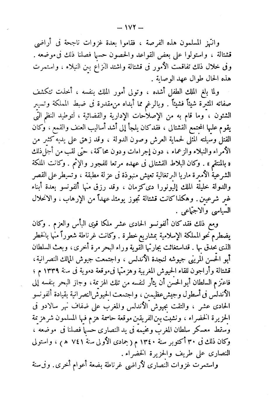 ومع ذلك فقد كان ألفونسو الحادى عشر ملكا قوى البأس والعزم. وكان يضطرم نحو المملكة الإسلامية بمشاريع خطرة. وكانت غرناطة شعوراً منها بالخطر الذى يحدق بها. قد استغاثت بجارتها القوية وراء البحر مرة أخرى، وبعث السلطان أبو الحسن المرينى جيوشه لنجدة الأندلس، واجتمعت جيوش الممالك النصرانية، قشتالة وأراجون للقاء الجيوش المغربية وهزمتها فى موقعة دموية فى سنة 1339 م؛ فاعتزم السلطان أبو الحسن أن يثأر لنفسه من تلك الهزيمة، وجاز البحر بنفسه إلى الأندلس فى أسطول وجيش عظيمين، واجتمعت الجيوش النصرانية بقيادة ألفونسو الحادى عشر، والتقت بجيوش الأندلس والمغرب على ضفاف نهر سالادو فى الجزيرة الخضراء، ونشبت بين الفريقين موقعة حاسمة هزم فيها المسلمون شر هزيمة وسقط معسكر سلطان المغرب ومخيمه فى يد النصارى حسبما فصلنا فى موضعه، وكان ذلك فى 30 أكتوبر سنة 1340 م (جمادى الأولى سنة 741 هـ)، واستولى النصارى على طريف والجزيرة الخضراء.