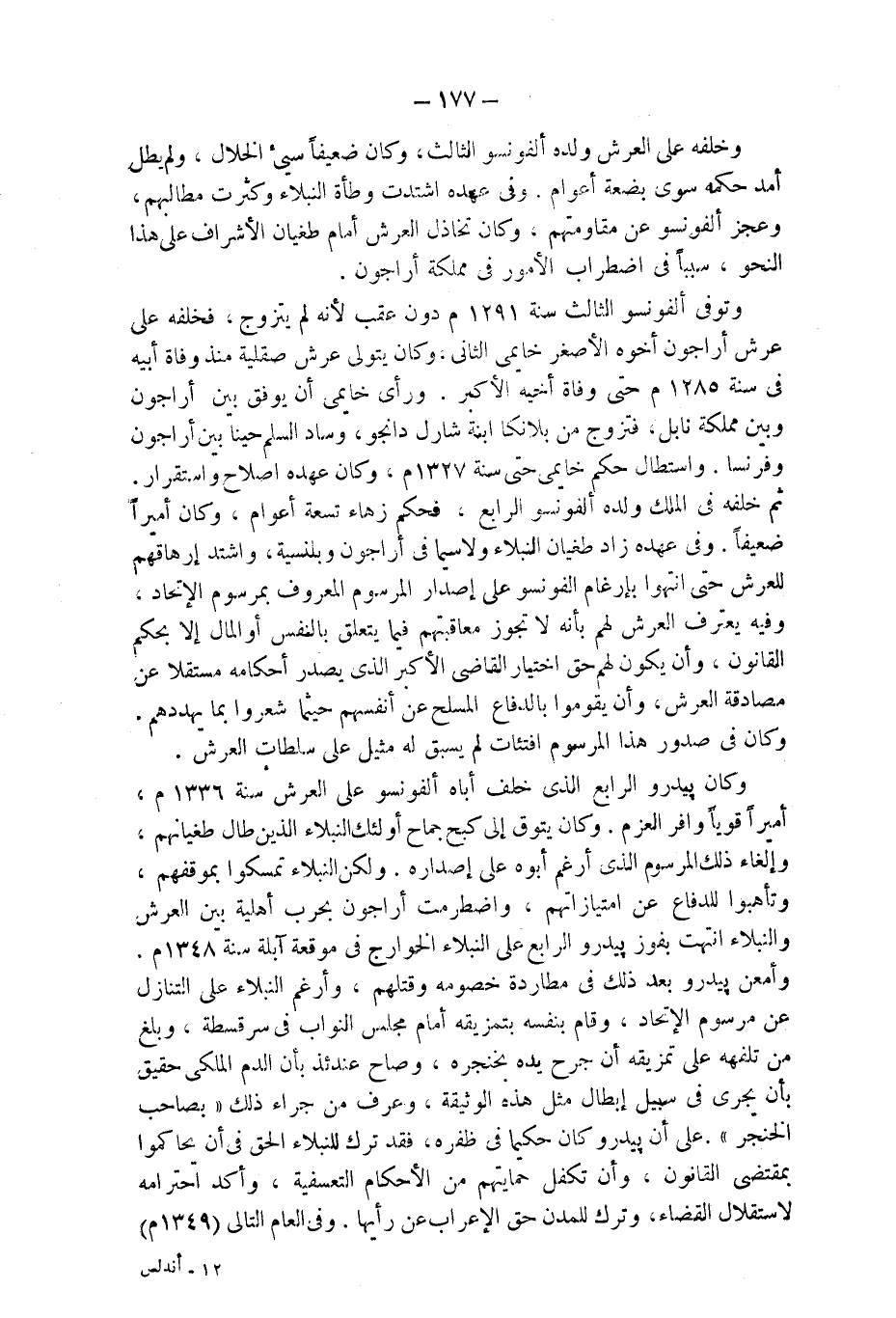 ثم خلفه فى الملك ولده ألفونسو الرابع، فحكم زهاء تسعة أعوام، وكان أميراً ضعيفاً. وفى عهده زاد طغيان النبلاء ولاسيما فى أراجون وبلنسية، واشتد إرهاقهم للعرش حتى انتهوا بإرغام ألفونسو على إصدار المرسوم المعروف بمرسوم الإتحاد، وفيه يعترف العرش لهم بأنه لا تجوز معاقبتهم فيما يتعلق بالنفس أو المال إلا بحكم القانون، وأن يكون لهم حق اختيار القاضى الأكبر الذى يصدر أحكامه مستقلا عن مصادقة العرش، وأن يقوموا بالدفاع المسلح عن أنفسهم حيثما شعروا بما يهددهم.