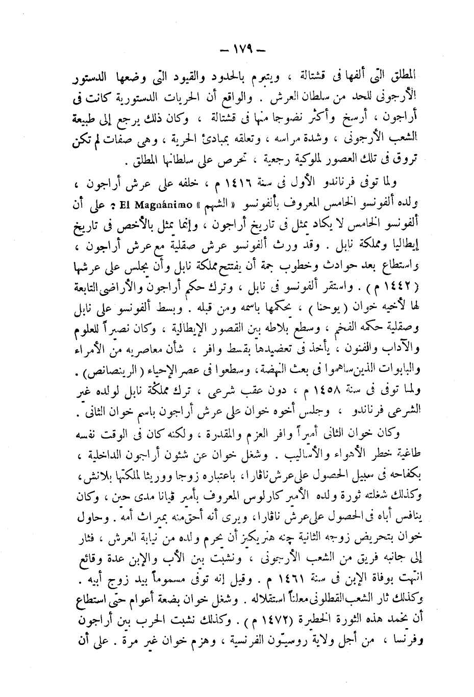 ولما توفى فرناندو الأول فى سة 1416 م، خلفه على عرش أراجون، ولده ألفونسو الخامس المعروف بألفونسو " الشهم " El Magnanimo، على أن ْألفونسو الخامس لا يكاد يمثل فى تاريخ أراجون، وإنما يمثل بالأخص فى تاريخ إيطاليا ومملكة نابل. وقد ورث ألفونسو عرش صقلية مع عرش أراجون، واستطاع بعد حوادث وخطوب جمة أن يفتتح مملكة نابل وأن يجلس على عرشها (1442 م). واستقر ألفونسو فى نابل، وترك حكم أراجون والأراضى التابعة لها لأخيه خوان (يوحنا)، يحكمها باسمه ومن قبله. وبسط ألفونسو على نابل وصقلية حكمه الفخم، وسطع بلاطه بين القصور الإيطالية، وكان نصيراً للعلوم والآداب والفنون، يأخذ فى تعضيدها بقسط وافر، شأن معاصريه من الأمراء والبابوات الذين ساهموا فى بعث النهضة، وسطعوا فى عصر الإحياء (الرينصانص).