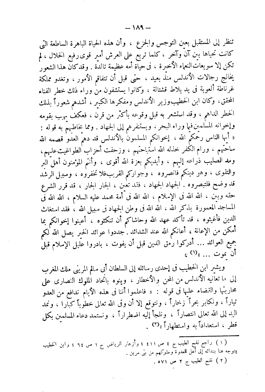 (¬1) راجع نفح الطيب ج 4 ص 411؛ وأزهار الرياض ج 1 ص 64؛ وابن الخطيب يتوجه هنا بندائه إلى أهل العدوة وملوكهم من بنى مرين.
