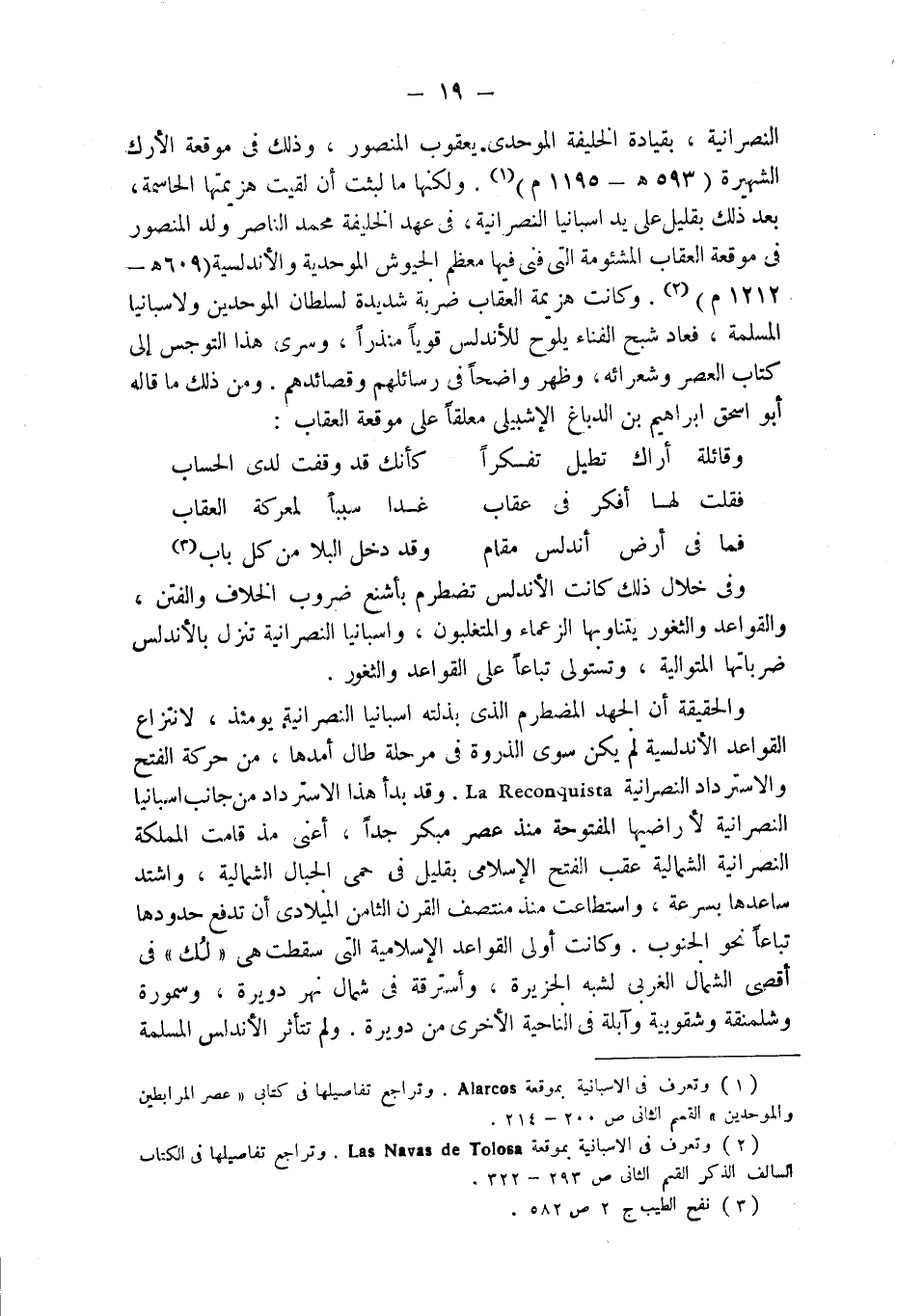 (¬2) وتعرف في الاسبانية بموقعة Las Navas de Tolosa. وتراجع تفاصيلها في الكتاب السالف الذكر القسم الثاني ص 293 - 322.