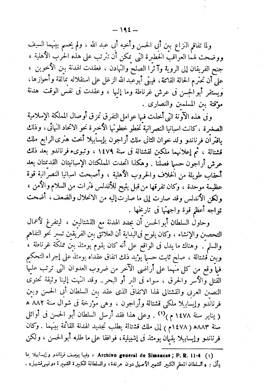 وحاول السلطان أبو الحسن أن يجدد الهدنة مع القشتاليين، ليتفرغ لأعمال التحصين والإنشاء، وكان يلوح فى البداية أن العلائق بين الفريقين تسير نحو التفاهم والسلم. وهناك ما يدل فى الواقع على أنه كان يقوم يومئذ بين مملكة غرناطة، وبين قشتالة، صلح ثابت حسبما يؤيد ذلك اتفاق عقداه يومئذ على إجراء التحكيم فيما وقع من كل منهما على أراضى الآخر من ضروب العدوان التى ترتب عليها القتل والأسر والحرق، سواء فى البر أو البحر. وقد انتهت إلينا وثيقة تحتوى النصين العربى والقشتالى لهذا الاتفاق الذى عقد بين السلطان أبى الحسن وبين فرناندو وإيسابيلا ملكى قشتالة وأراجون، وهى مؤرخة فى شوال سنة 882 هـ (يناير سنة 1478 م) (¬1). وعلى هذا فقد أرسل السلطان أبو الحسن فى أوائل سنة 883 هـ (1478 م) إلى ملك قشتالة يطلب تجديد الهدنة القائمة بينهما. وكان فرناندو وإيسابيلا يقيمان يومئذ فى إشبيلية، فوافقا على ما طلبه أبو الحسن، ولكن