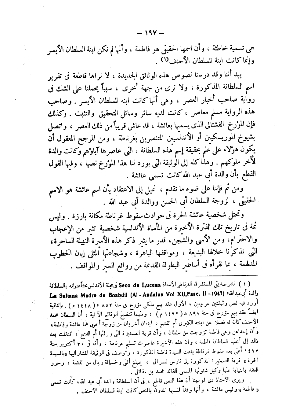 بيد أننا وقد درسنا نصوص هذه الوثائق الجديدة، لا نراها قاطعة فى تقرير اسم السلطانة المذكورة، ولا نرى من جهة أخرى، سبباً يحملنا على الشك فى رواية صاحب أخبار العصر، وهى أنها كانت ابنه للسلطان الأيسر. وصاحب هذه الرواية مسلم معاصر، كانت لديه سائر وسائل التحقيق والتثبت. وكذلك فإن المؤرخ القشتالى الذى يسميها بعائشة، قد عاش قريباً من ذلك العصر، واتصل بشيوخ الموريسكيين أو الأندلسيين المتنصرين بغرناطة، ومن المرجح المعقول أن يكون هؤلاء على علم بحقيقة إسم هذه السلطانة، التى عاصرها آباؤهم وكانت والدة لآخر ملوكهم. وهذا كله إلى الوثيقة التى يورد لنا هذا المؤرخ نصها، وفيها القول القطع بأن والدة أبى عبد الله كانت تسمى عائشة.