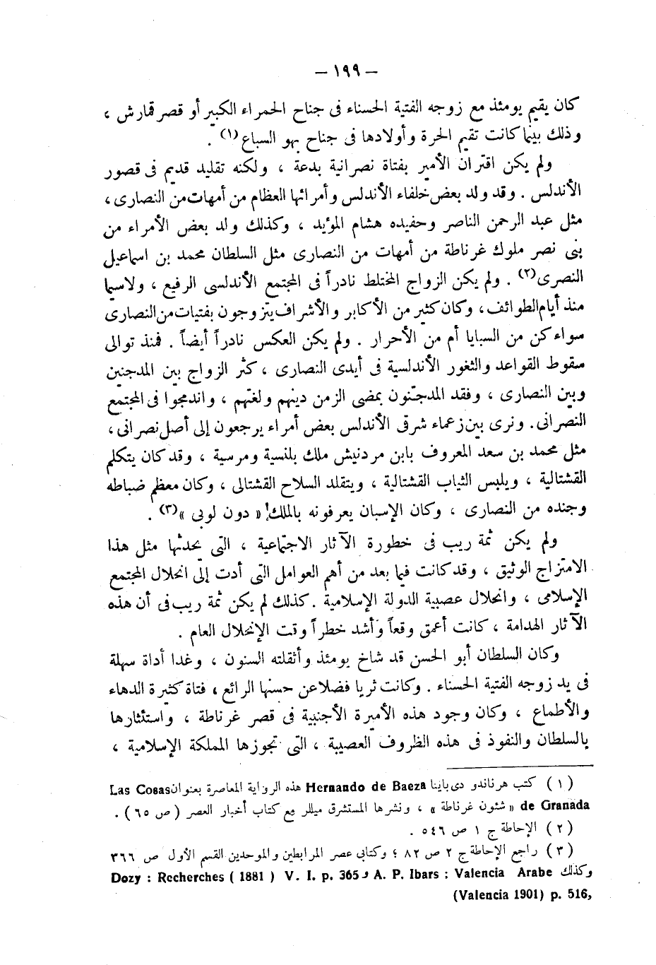 ولم يكن اقتران الأمير بفتاة نصرانية بدعة، ولكنه تقليد قديم فى قصور الأندلس. وقد ولد بعض خلفاء الأندلس وأمرائها العظام من أمهات من النصارى، مثل عبد الرحمن الناصر وحفيده هشام المؤيد، وكذلك ولد بعض الأمراء من بنى نصر ملوك غرناطة من أمهات من النصارى مثل السلطان محمد بن اسماعيل النصرى (¬2). ولم يكن الزواج المختلط نادراً فى المجتمع الأندلسى الرفيع، ولاسيما منذ أيام الطوائف، وكان كثير من الأكابر والأشراف يتزوجون بفتيات من النصارى سواء كن من السبايا أم من الأحرار. ولم يكن العكس نادراً أيضاً. فمنذ توالى سقوط القواعد والثغور الأندلسية فى أيدى النصارى، كثر الزواج بين المدجنين وبين النصارى، وفقد المدجّنون بمضى الزمن دينهم ولغتهم، واندمجوا فى المجتمع النصرانى. ونرى بين زعماء شرقى الأندلس بعض أمراء يرجعون إلى أصل نصرانى، مثل محمد بن سعد المعروف بابن مردنيش ملك بلنسية ومرسية، وقد كان يتكلم القشتالية، ويلبس الثياب القشتالية، ويتقلد السلاح القشتالى، وكان معظم ضباطه وجنده من النصارى، وكان الإسبان يعرفونه بالملك "دون لوبى" (¬3).