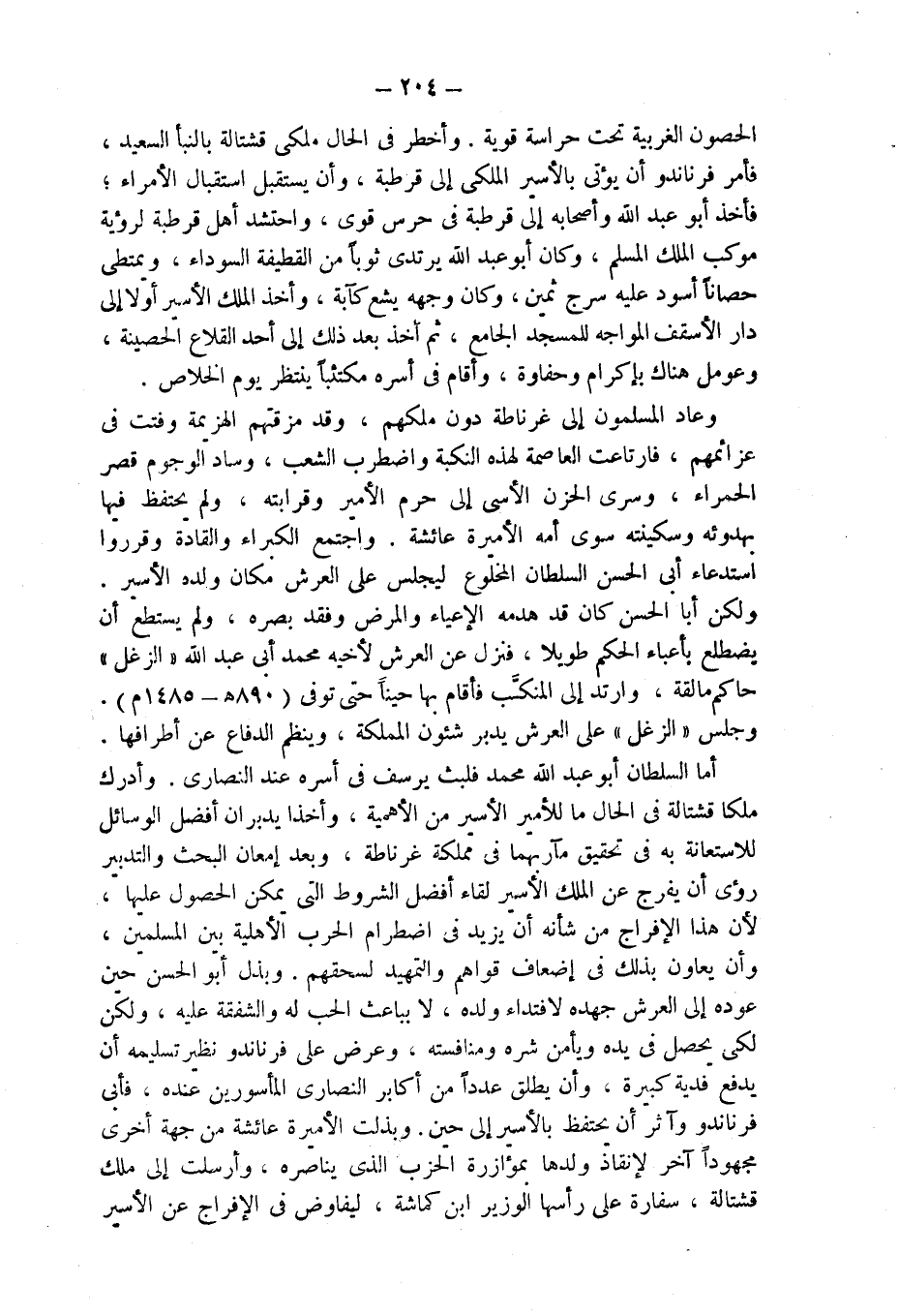 الحصون الغربية تحت حراسة قوية. وأخطر فى الحال ملكى قشتالة بالنبأ السعيد، فأمر فرناندو أن يؤتى بالأسير الملكى إلى قرطبة، وأن يستقبل استقبال الأمراء؛ فأخذ أبو عبد الله وأصحابه إلى قرطبة فى حرس قوى، واحتشد أهل قرطبة لرؤية موكب الملك المسلم، وكان أبو عبد الله يرتدى ثوباً من القطيفة السوداء، ويمتطى حصاناً أسود عليه سرج ثمين، وكان وجهه يشع كآبة، وأخذ الملك الأسير أولا إلى دار الأسقف المواجه للمسجد الجامع، ثم أخذ بعد ذلك إلى أحد القلاع الحصينة، وعومل هناك بإكرام وحفاوة، وأقام فى أسره مكتئباً ينتظر يوم الخلاص.