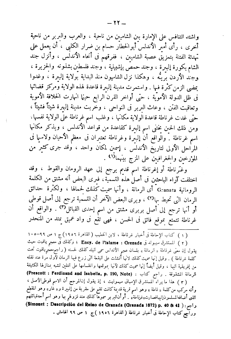 (¬3) هذا ما يراه المستشرق الإسبانى سيمونيت، إذ يقول إن المرجح أن الاسم قوطى الأصل، وأنه مركب من كلمة " ناطة " وهو اسم قرية قديمة كانت تقع على مقربة من إلبيرة و" غار" وهو المقطع الذي أضافه المسلمون إليها فصارت "غرناطة ". أو أن البربر سموها كذلك عند نزولهم بها وهو اسم أحد قبائلهم راجع: ( Simonet: Descripcion del Reino de Granada (Granada 1872) p. 40 & 41) وراجع كتاب الإحاطة في أخبار غرناطة (القاهرة 1956) ج 1 ص 99 الهامش.