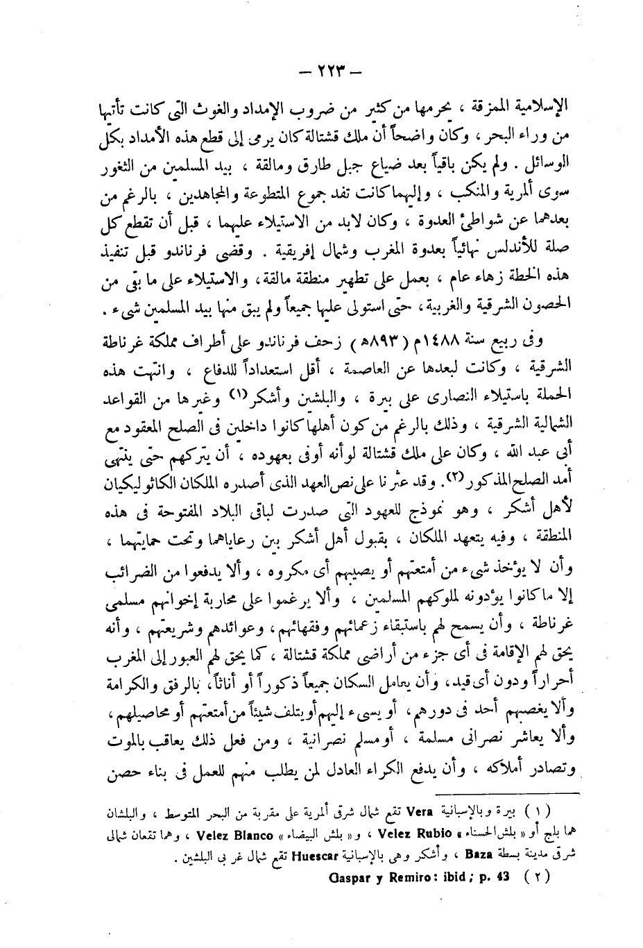 الإسلامية الممزقة، يحرمها من كثير من ضروب الإمداد والغوث التى كانت تأتيها من وراء البحر، وكان واضحاً أن ملك قشتالة يرمى إلى قطع هذه الأمداد بكل الوسائل. ولم يكن باقياً بعد ضياع جبل طارق ومالقة، بيد المسلمين من الثغور سوى ألمرية والمنكب، وإليهما كانت تفد جموع المتطوعة والمجاهدين، بالرغم من بعدهما عن شواطىء العدوة، وكان لابد من الاستيلاء عليهما، قبل أن تقطع كل صلة للأندلس نهائياً بعدوة المغرب وشمال إفريقية. وقضى فرناندو قبل تنفيذ هذه الخطة زهاء عام، يعمل على تطهير منطقة مالقة، والاستيلاء على ما بقى من الحصون الشرقية والغربية، حتى استولى عليها جميعاً ولم يبق منها بيد المسلمين شىء. وفى ربيع سنة 1488 م (893 هـ) زحف فرناندو على أطراف مملكة غرناطة الشرقية، وكانت لبعدها عن العاصمة، أقل استعداداً للدفاع، وانتهت هذه الحملة باستيلاء النصارى على بيرة، والبلشين وأشكر (¬1) وغيرها من القواعد الشمالية الشرقية، وذلك بالرغم من كون أهلها كانوا داخلين فى الصلح المعقود مع أبى عبد الله، وكان على ملك قشتالة لو أنه أوفى بعهوده، أن يتركهم حتى ينتهى أمد الصلح المذكور (¬2). وقد عثرنا على نص العهد الذى أصدره الملكان الكاثوليكيان لأهل أشكر، وهو نموذج للعهود التى صدرت لباقى البلاد المفتوحة فى هذه المنطقة، وفيه يتعهد الملكان، بقبول أهل أشكر بين رعاياهما وتحت حمايتهما، وأن لا يؤخذ شىء من أمتعتهم أو يصيبهم أى مكروه، وألا يدفعوا من الضرائب إلا ما كانوا يؤدونه لملوكهم المسلمين، وألا يرغموا على محاربة إخوانهم مسلمى غرناطة، وأن يسمح لهم باستبقاء زعمائهم وفقهائهم، وعوائدهم وشريعتهم، وأنه يحق لهم الإقامة فى أى جزء من أراضى مملكة قشتالة، كما يحق لهم العبور إلى المغرب أحراراً ودون أى قيد، وأن يعامل السكان جميعاً ذكوراً أو إناثاً، بالرفق والكرامة وألا يغصبهم أحد فى دورهم، أو يسىء إليهم أو يتلف شيئاً من أمتعتهم أو محاصيلهم، وألا يعاشر نصرانى مسلمة، أو مسلم نصرانية، ومن فعل ذلك يعاقب بالموت وتصادر أملاكه، وأن يدفع الكراء العادل لمن يطلب منهم للعمل فى بناء حصن
