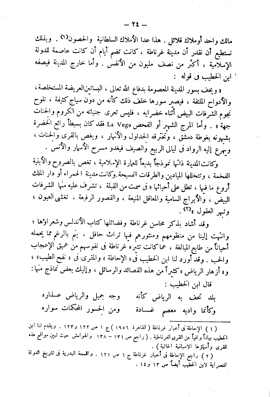 (¬1) الإحاطة في أخبار غرناطة (القاهرة 1956) ج 1 ص 122 و 123. ويقدم لنا ابن الخطيب بياناً وافياً عن القرى الغرناطية. (راجع ص 131 - 138 والهوامش حيث تبين مواقع هذه القرى وأسماؤها الاسبانية الحالية).