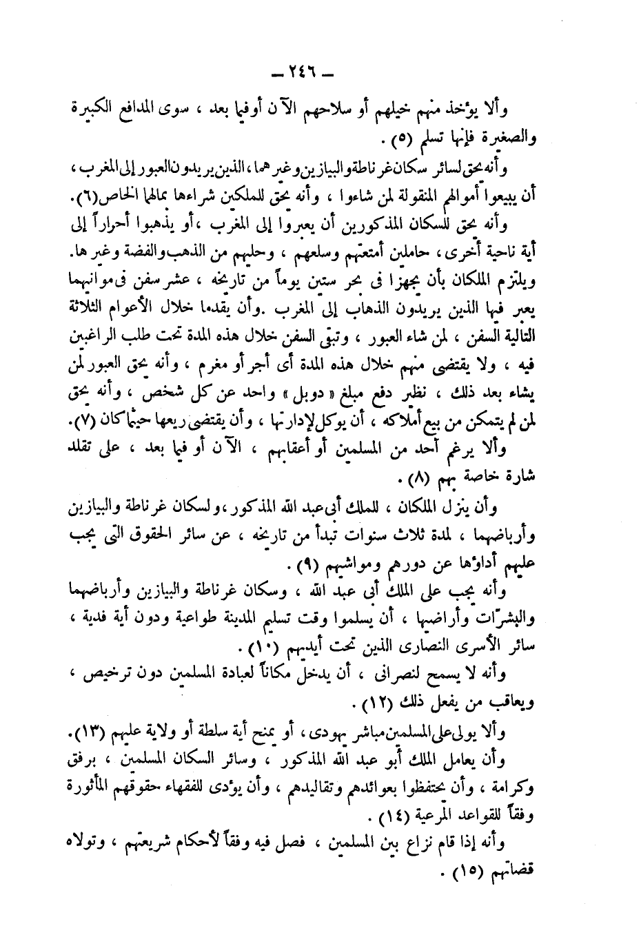 وأن يعامل الملك أبو عبد الله المذكور، وسائر السكان المسلمين، برفق وكرامة، وأن يحتفظوا بعوائدهم وتقاليدهم، وأن يؤدى للفقهاء حقوقهم المأثورة وفقاً للقواعد المرعية (14).