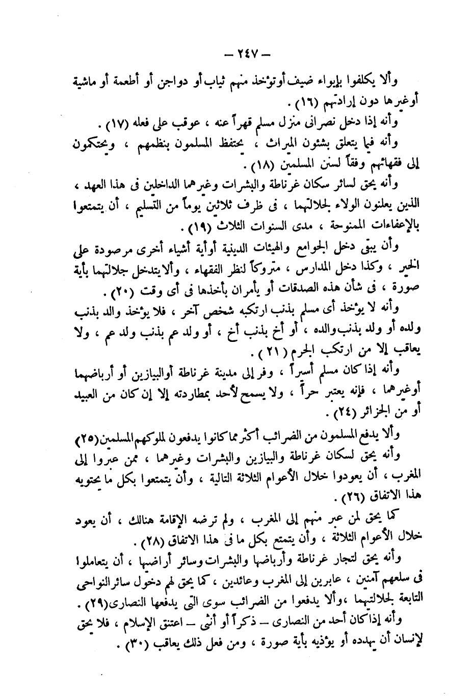 وألا يدفع المسلمون من الضرائب أكثر مما كانوا يدفعون لملوكهم المسلمين (25).