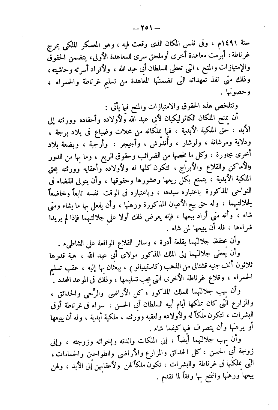 أن يمنح الملكان الكاثوليكيان لأبى عبد الله ولأولاده وأحفاده وورثته إلى الأبد، حق الملكية الأبدية، فيما يملكانه من محلات وضياع فى بلاد برجة، ودلاية ومرشانة، ولوشار، وأندرش، وأجيجر، وأرجبة، وبضعة بلاد أخرى مجاورة، وكل ما يخصها من الضرائب وحقوق الريع، وما بها من الدور والأماكن والقلاع والأبراج، لتكون كلها له ولأولاده وأعقابه وورثته بحق الملكية الأبدية، يتمتع بكل ريعها وعشورها وحقوقها، وأن يتولى القضاء فى النواحى المذكورة باعتباره سيدها، وباعتباره فى الوقت نفسه تابعاً وخاضعاً لجلالتيهما، وله حق بيع الأعيان المذكورة ورهنها، وأن يفعل بها ما يشاء ومتى شاء، وأنه متى أراد بيعها، فإنه يعرض ذلك أولا على جلالتيهما فإذا لم يريدا شراءها، فله أن يبيعها لمن شاء.