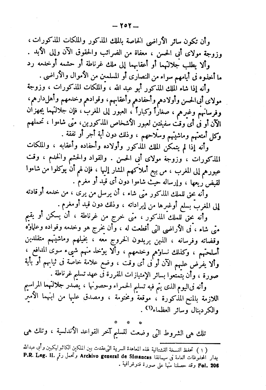 (¬1) تحفظ النسخة القشتالية لهذه المعاهدة السرية التى عقدت بين الملكين الكاثوليكيين وأبى عبد الله بدار المحفوظات العامة فى سيمانقا Archivo general de Simancas وتحمل رقم P. R. Leg. II. Fol. 206 وقد حصلنا منها على صورة فتوغرافية