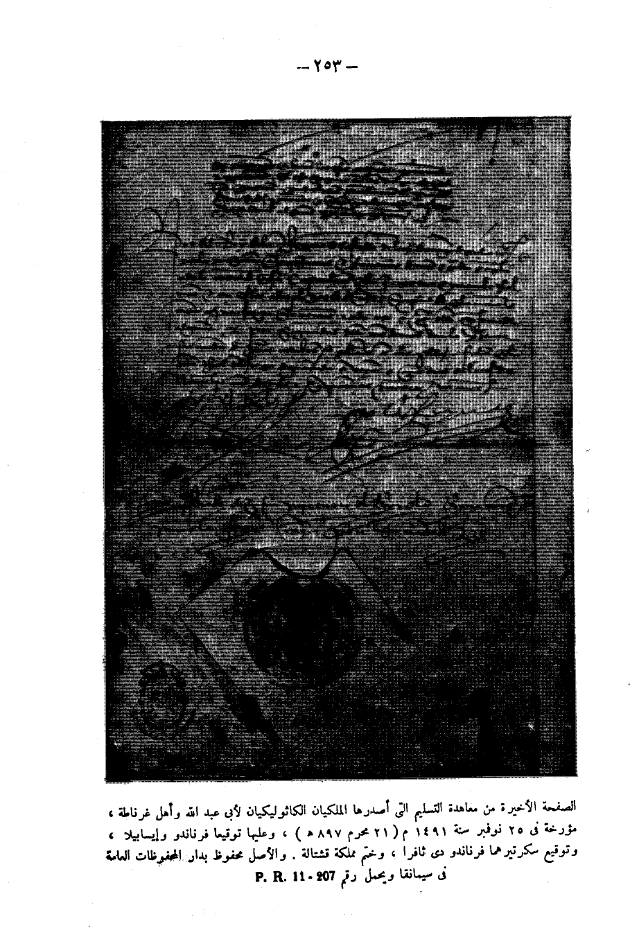 الصفحة الأخيرة من معاهدة التسليم التى أصدرها الملكان الكاثوليكيان لأبى عبد الله وأهل غرناطة، مؤرخة فى 25 نوفمبر سنة 1491 م (21 محرم 897 هـ)، وعليها توقيعا فرناندو وإيسابيلا، وتوقيع سكرتيرهما فرناندو دى ثافرا، وختم مملكة قشتالة. والأصل محفوظ بدار المحفوظات العامة فى سيمانقا ويحمل رقم P. R. 11-207