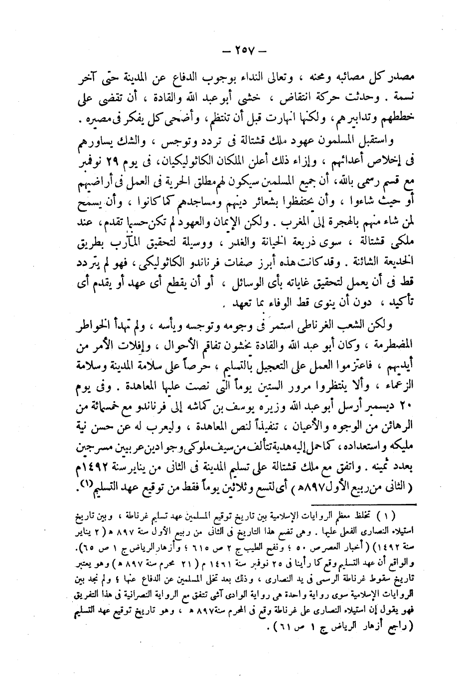 (¬1) تخلط معظم الروايات الإسلامية بين تاريخ توقيع المسلمين عهد تسليم غرناطة، وبين تاريخ استيلاء النصارى الفعلى عليها. وهى تضع هذا التاريخ فى الثانى من ربيع الأول سنة 897 هـ (2 يناير سنة 1492) (أخبار العصر ص 50؛ ونفح الطيب ج 2 ص 615؛ وأزهار الرياض ج 1 ص 65). والواقع أن عهد التسليم وقع كما رأينا فى 25 نوفمبر سنة 1491 م (21 محرم سنة 897 هـ) وهو يعتبر تاريخ سقوط غرناطة الرسمى فى يد النصارى، وذلك بعد تخلى المسلمين عن الدفاع عنها؛ ولم نجد بين الروايات الإسلامية سوى رواية واحدة هى رواية الوادى آشى تتفق مع الرواية النصرانية فى هذا التفريق فهو يقول إن استيلاء النصارى على غرناطة وقع فى المحرم سنة 897 هـ، وهو تاريخ توقيع عهد التسليم (راجع أزهار الرياض ج 1 ص 61)