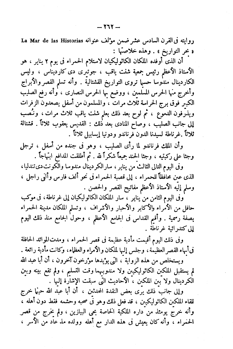 ويستخلص من هذه الرواية، التى يؤيدها مؤرخون آخرون، أن أبا عبد الله لم يستقبل الملكين الكاثوليكيين ولا مندوبيهما وقت التسليم، ولم تقع بينه وبين الكردينال ولا بين الملكين، الأحاديث التى سبقت الإشارة إليها.