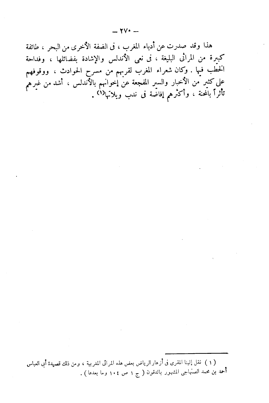 (¬1) نقل إلينا المقرى فى أزهار الرياض بعض هذه المراثى المغربية، ومن ذلك قصيدة أبى العباس أحمد بن محمد الصنهاجى المشهور بالدقون (ج 1 ص 104 وما بعدها)
