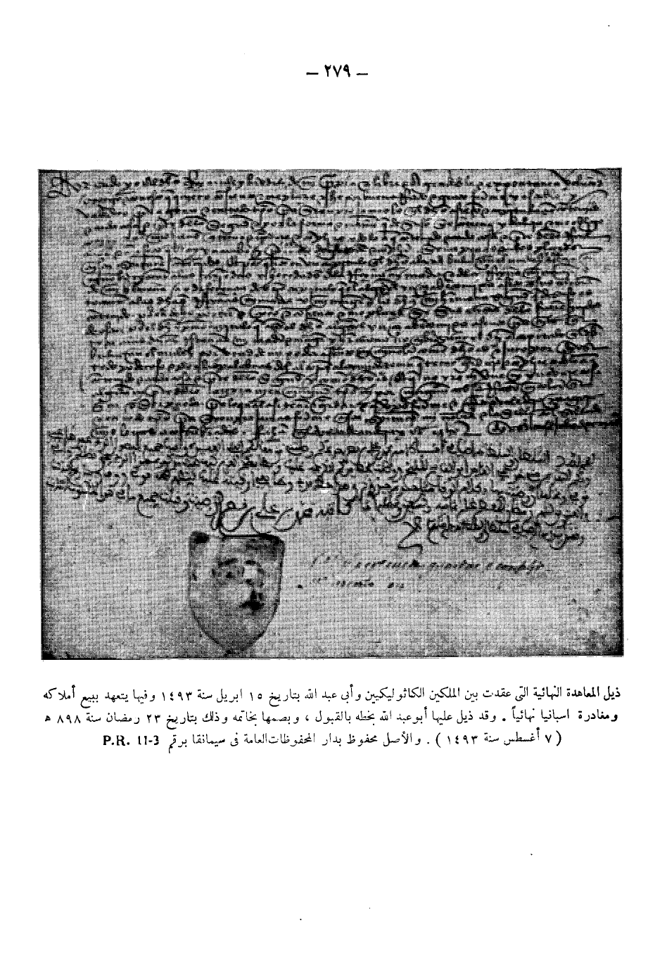 صورة: ذيل المعاهدة النهائية التى عقدت بين الملكين الكاثوليكيين وأبى عبد الله بتاريخ 15 ابريل سنة 1493 م وفيها يتعهد ببيع أملاكه ومغادرة اسبانيا نهائياً. وقد ذيل عليها أبو عبد الله بخطه بالقبول، وبصمها بخاتمه وذلك بتاريخ 23 رمضان سنة 898 هـ (7 أغسطس سنة 1493). والأصل محفوظ بدار المحفوظات العامة فى سيمانقا برقم P. R. 11-3