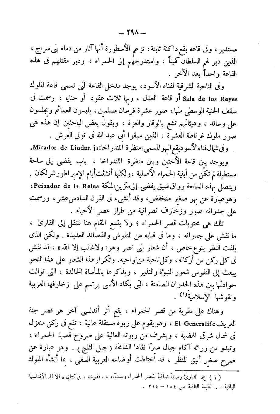 (¬1) يجد القارىء وصفاً ضافياً لقصر الحمراء ومنشآته، ونقوشه، فى كتابى "الآثار الأندلسية الباقية". الطبعة الثانية ص 184 - 214