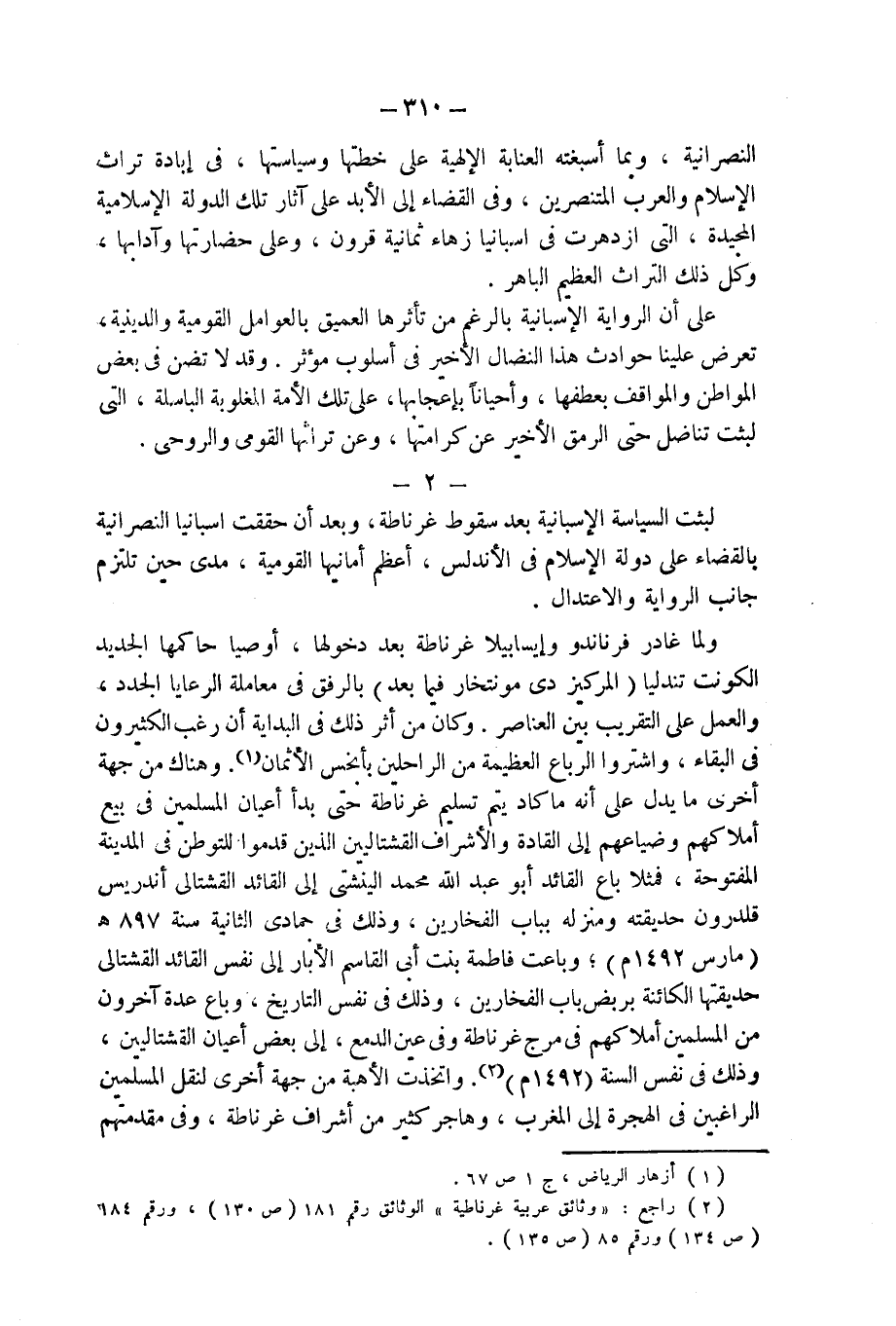 النصرانية، وبما أسبغته العناية الإلهية على خطتها وسياستها، فى إبادة تراث الإسلام والعرب المتنصرين، وفى القضاء إلى الأبد على آثار تلك الدولة الإسلامية المجيدة، التى ازدهرت فى اسبانيا زهاء ثمانية قرون، وعلى حضارتها وآدابها، وكل ذلك التراث العظيم الباهر.