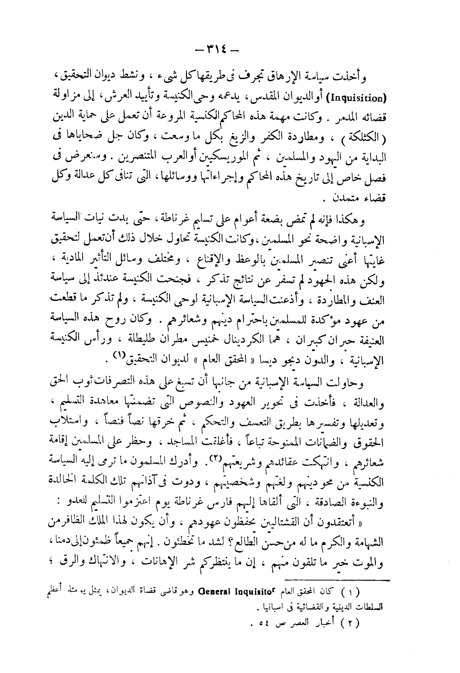 وأخذت سياسة الإرهاق تجرف فى طريقها كل شىء، ونشط ديوان التحقيق، ( Inquisition) أو الديوان المقدس، يدعمه وحى الكنيسة وتأييد العرش، إلى مزاولة قضائه المدمر. وكانت مهمة هذه المحاكم الكنسية المروعة أن تعمل على حماية الدين (الكثلكة)، ومطاردة الكفر والزيغ بكل ما وسعت، وكان جل ضحاياها فى البداية من اليهود والمسلمين، ثم الموريسكيين أو العرب المتنصرين. وسنعرض فى فصل خاص إلى تاريخ هذه المحاكم وإجراءاتها ووسائلها، التى تنافى كل عدالة وكل قضاء متمدن.