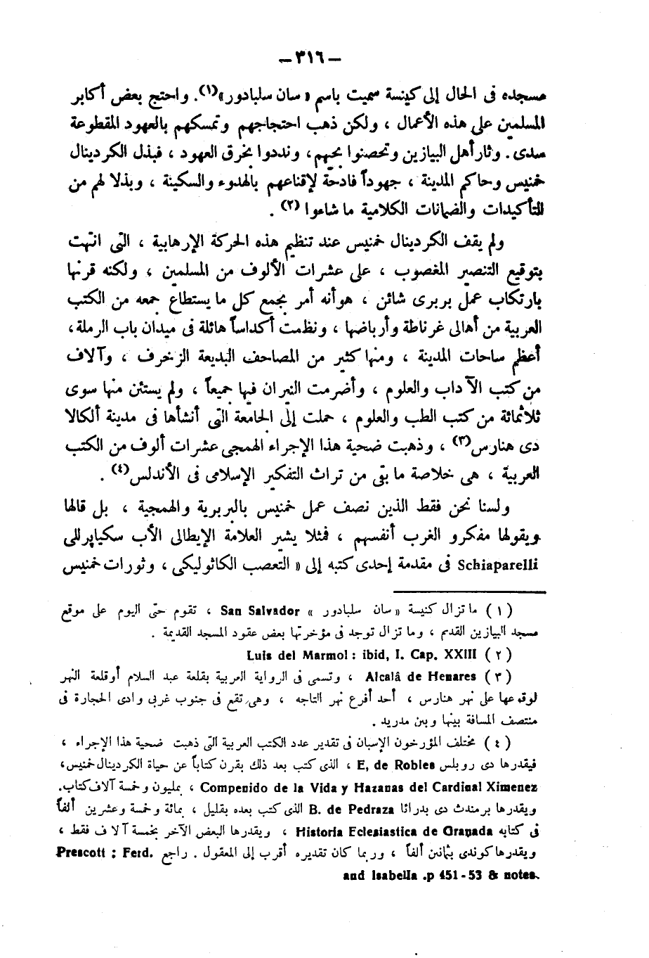 (¬4) يختلف المؤرخون الإسبان فى تقدير عدد الكتب العربية التى ذهبت ضحية هذا الإجراء، فيقدرها دى روبلس E. de Robles، الذى كتب بعد ذلك بقرن كتاباً عن حياة الكردينال خمنيس، Compenido de la Vida y Hazanas del Cardinal Ximenez، بمليون وخمسة آلاف كتاب. ويقدرها برمندث دى بدراثا B. de Pedraza الذى كتب بعده بقليل، بمائة وخمسة وعشرين ألفاً فى كتابه Historia Eclesiastica de Granada، ويقدرها البعض الآخر بخمسة آلاف فقط، ويقدرها كوندى بثمانين ألفاً، وربما كان تقديره أقرب إلى المعقول. راجع Prescott: Ferd. and Isabella, p. 451 - 53 & notes