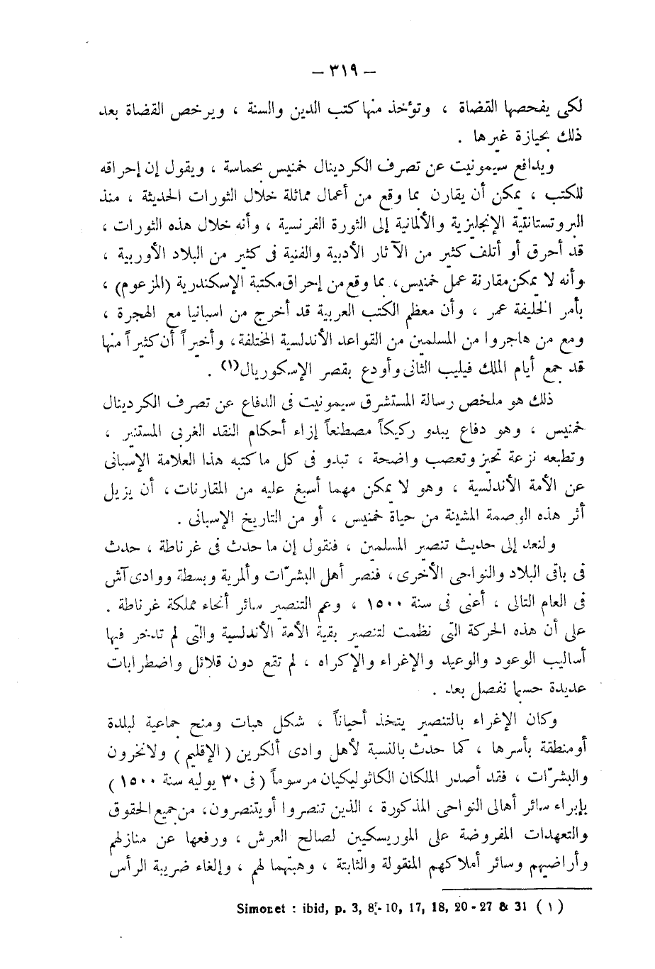 ذلك هو ملخص رسالة المستشرق سيمونيت فى الدفاع عن تصرف الكردينال خمنيس، وهو دفاع يبدو ركيكاً مصطنعاً إزاء أحكام النقد الغربى المستنير، وتطبعه نزعة تحيز وتعصب واضحة، تبدو فى كل ما كتبه هذا العلامة الإسبانى عن الأمة الأندلسية، وهو لا يمكن مهما أسبغ عليه من المقارنات، أن يزيل أثر هذه الوصمة المشينة من حياة خمينس، أو من التاريخ الإسبانى.