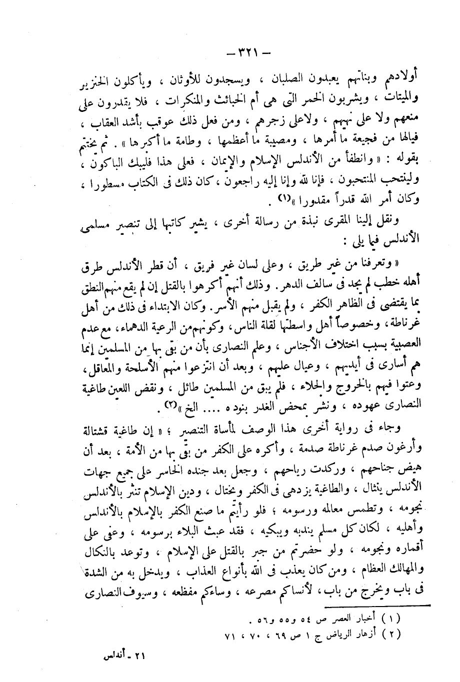 "وتعرفنا من غير طريق، وعلى لسان غير فريق، أن قطر الأندلس طرق أهله خطب لم يجد فى سالف الدهر. وذلك أنهم أكرهوا بالقتل إن لم يقع منهم النطق بما يقتضى فى الظاهر الكفر، ولم يقبل منهم الأسر. وكان الابتداء فى ذلك من أهل غرناطة، وخصوصاً أهل واسطتها لقلة الناس، وكونهم من الرعية الدهماء، مع عدم العصبية بسبب اختلاف الأجناس، وعلم النصارى بأن من بقى بها من المسلمين إنما هم أسارى فى أيديهم، وعيال عليهم، وبعد أن انتزعوا منهم الأسلحة والمعاقل، وعتوا فيهم بالخروج والجلاء، فلم يبق من المسلمين طائل، ونقض اللعين طاغية النصارى عهوده، ونشر بمحض الغدر بنوده .... الخ" (¬2).