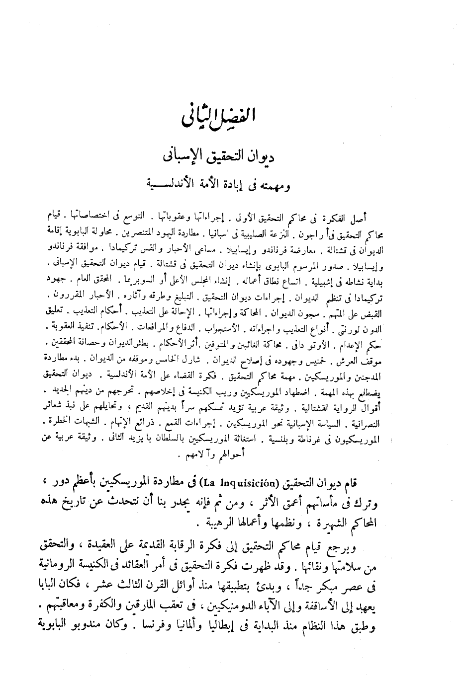 أصل الفكرة فى محاكم التحقيق الأولى. إجراءاتها وعقوباتها. التوسع فى اختصاصاتها. قيام محاكم التحقيق فى أراجون. النزعة الصليبية فى اسبانيا. مطاردة اليهود المتنصرين. محاولة البابوية إقامة الديوان فى قشتالة. معارضة فرناندو وإيسابيلا. مساعى الأحبار والقس تركيمادا. موافقة فرناندو وإيسابيلا. صدور المرسوم البابوى بإنشاء ديوان التحقيق فى قشتالة. قيام ديوان التحقيق الإسبانى. بداية نشاطه فى إشبيلية. اتساع نطاق أعماله. إنشاء المجلس الأعلى أو السوبريما. المحقق العام. جهود تركيمادا فى تنظيم الديوان. إجراءات ديوان التحقيق. التبليغ وطرقه وآثاره. الأحبار المقررون. القبض على المتهم. سجون الديوان. المحاكمة وإجراءاتها. الإحالة على التعذيب. أحكام التعذيب. تعليق الدون لورنتى. أنواع التعذيب وإجراءاته. الإستجواب. الدفاع والمرافعات. الأحكام. تنفيذ العقوبة. حكم الإعدام. الأوتو دافى. محاكمة الغائبين والمتوفين. أثر الأحكام. بطش الديوان وحصانة المحققين. موقف العرش. خمنيس وجهوده فى إصلاح الديوان. شارل الخامس وموقفه من الديوان. بدء مطاردة المدجنين والموريسكيين. مهمة محاكم التحقيق. فكرة القضاء على الأمة الأندلسية. ديوان التحقيق يضطلع بهذه المهمة. اضطهاد الموريسكيين وريب الكنيسة فى إخلاصهم. تحرجهم من دينهم الجديد. أقوال الرواية القشتالية. وثيقة عربية تؤيد تمسكهم سراً بدينهم القديم، وتحايلهم على نبذ شعائر النصرانية. السياسة الإسبانية نحو الموريسكيين. إجراءات القمع. ذرائع الإتهام. الشبهات الخطرة. الموريسكيون فى غرناطة وبلنسية. استغاثة الموريسكيين بالسلطان بايزيد الثانى. وثيقة عربية عن أحوالهم وآلامهم.