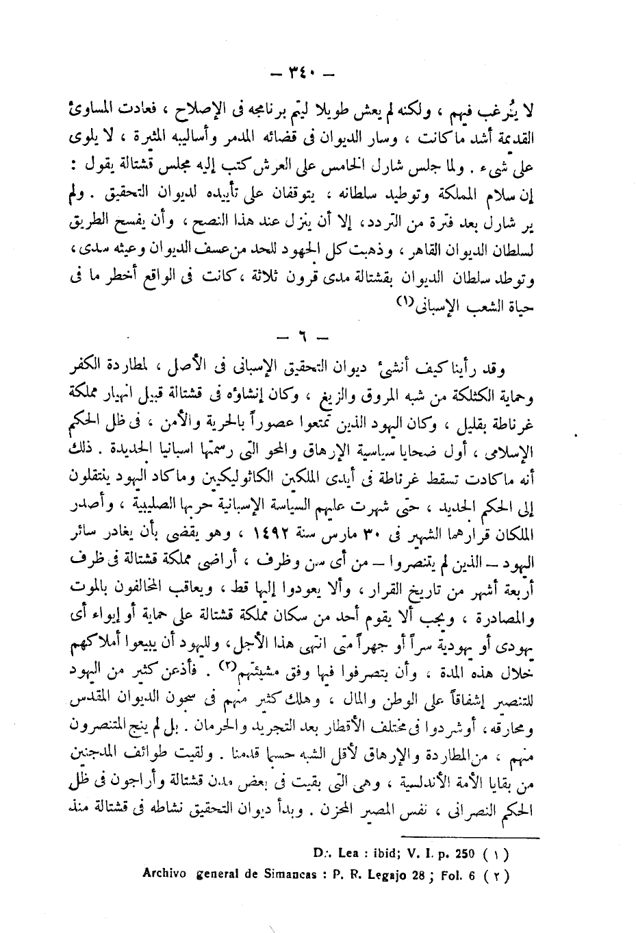 وقد رأينا كيف أنشىء ديوان التحقيق الإسبانى فى الأصل، لمطاردة الكفر وحماية الكثلكة من شبه المروق والزيغ، وكان إنشاؤه فى قشتالة قبيل انهيار مملكة غرناطة بقليل، وكان اليهود الذين تمتعوا عصوراً بالحرية والأمن، فى ظل الحكم الإسلامى، أول ضحايا سياسة الإرهاق والمحو التى رسمتها اسبانيا الجديدة. ذلك أنه ما كادت تسقط غرناطة فى أيدى الملكين الكاثوليكيين وما كاد اليهود ينتقلون إلى الحكم الجديد، حتى شهرت عليهم السياسة الإسبانية حربها الصليبية، وأصدر الملكان قرارهما الشهير فى 30 مارس سنة 1492، وهو يقضى بأن يغادر سائر اليهود -الذين لم يتنصروا- من أى سن وظرف، أراضى قشتالة فى ظرف أربعة أشهر من تاريخ القرار، وألا يعودوا إليها قط، ويعاقب المخالفون بالموت والمصادرة، ويجب ألا يقوم أحد من سكان مملكة قشتالة على حماية أو إيواء أى يهودى أو يهودية سراً أو جهراً متى انتهى هذا الأجل، ولليهود أن يبيعوا أملاكهم خلال هذه المدة، وأن يتصرفوا فيها وفق مشيئتهم (¬2). فأذعن كثير من اليهود للتنصير إشفاقاً على الوطن والمال، وهلك كثير منهم فى سجون الديوان المقدس ومحارقه، أو شردوا فى مختلف الأقطار بعد التجريد والحرمان. بل لم ينج المتنصرون منهم، من المطاردة والإرهاق لأقل الشبه حسبما قدمنا. ولقيت طوائف المدجنين من بقايا الأمة الأندلسية، وهى التى بقيت فى بعض مدن قشتالة وأراجون فى ظل الحكم النصرانى، نفس المصير المحزن. وبدأ ديوان التحقيق نشاطه فى قشتالة منذ