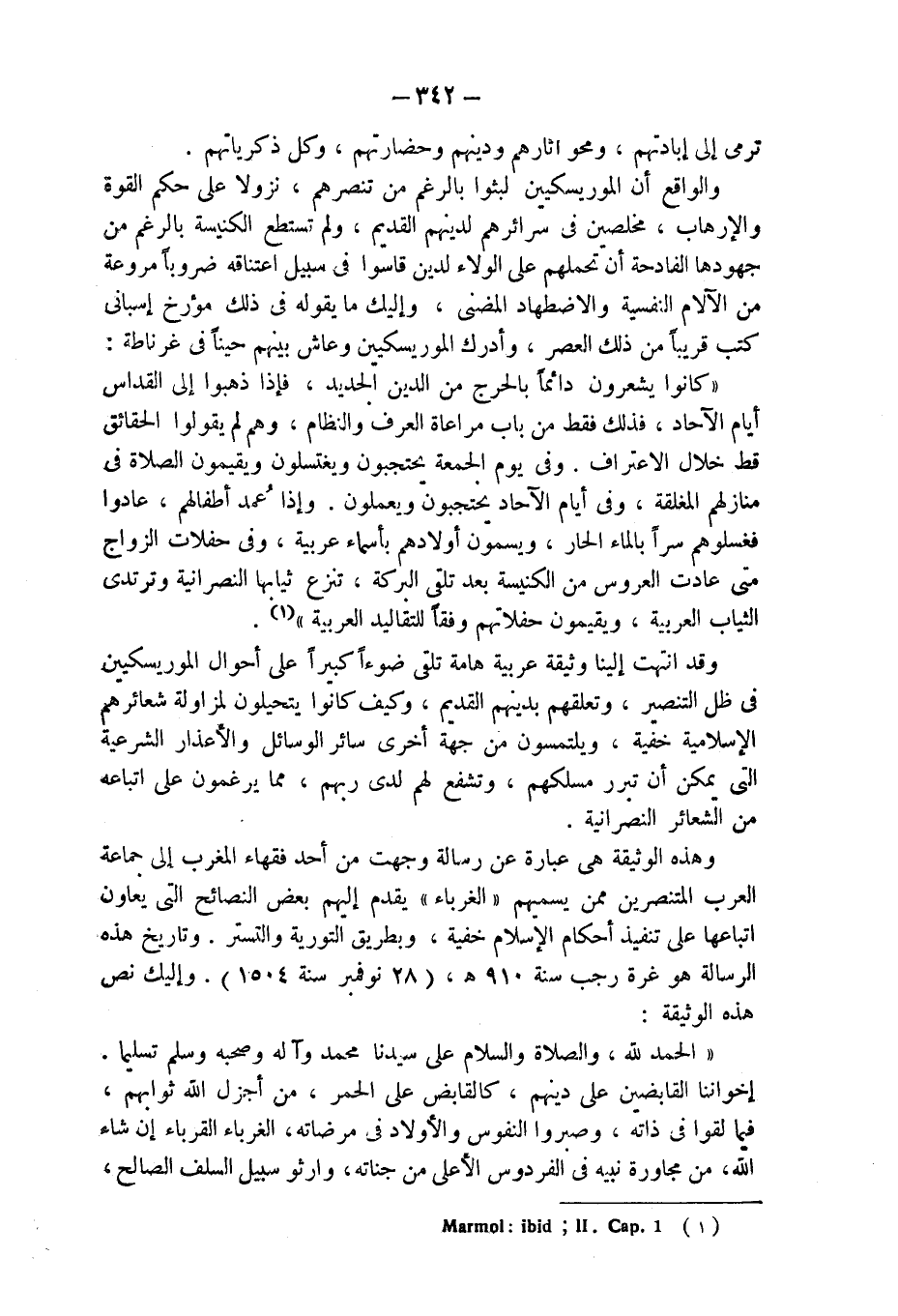 وهذه الوثيقة هى عبارة عن رسالة وجهت من أحد فقهاء المغرب إلى جماعة العرب المتنصرين ممن يسميهم "الغرباء" يقدم إليهم بعض النصائح التى يعاون اتباعها على تنفيذ أحكام الإسلام خفية، وبطريق التورية والتستر. وتاريخ هذه الرسالة هو غرة رجب سنة 910 هـ، (28 نوفمبر سنة 1504). وإليك نص هذه الوثيقة: