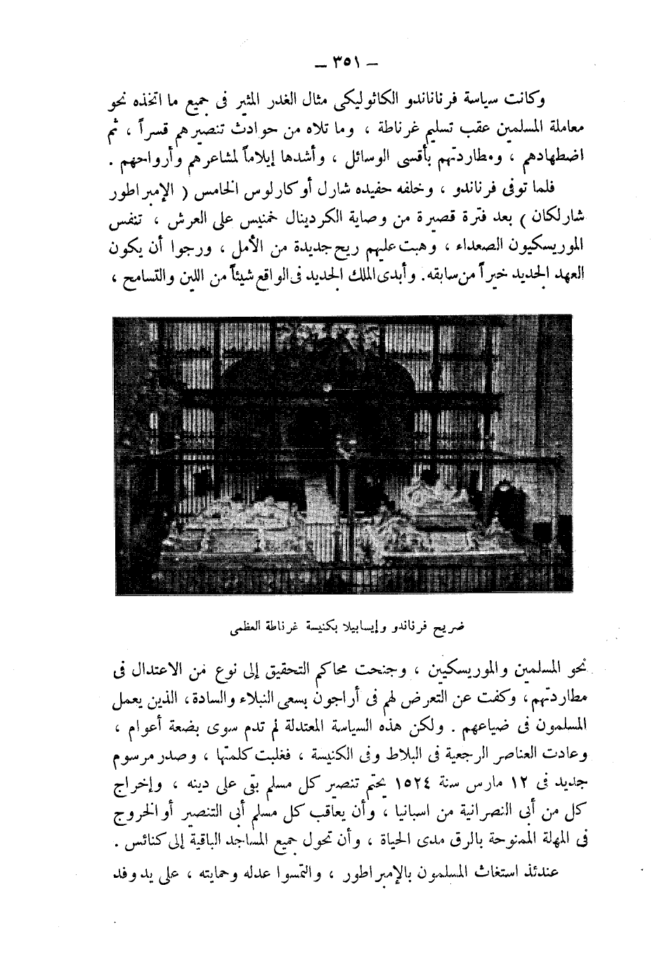 نحو المسلمين والموريسكيين، وجنحت محاكم التحقيق إلى نوع من الاعتدال فى مطاردتهم، وكفت عن التعرض لهم فى أراجون بسعى النبلاء والسادة، الذين يعمل المسلمون فى ضياعهم. ولكن هذه السياسة المعتدلة لم تدم سوى بضعة أعوام، وعادت العناصر الرجعية فى البلاط وفى الكنيسة، فغلبت كلمتها، وصدر مرسوم جديد فى 12 مارس سنة 1524 م يحتم تنصير كل مسلم بقى على دينه، وإخراج كل من أبى النصرانية من اسبانيا، وأن يعاقب كل مسلم أبى التنصير أو الخروج فى المهلة الممنوحة بالرق مدى الحياة، وأن تحوّل جميع المساجد الباقية إلى كنائس.