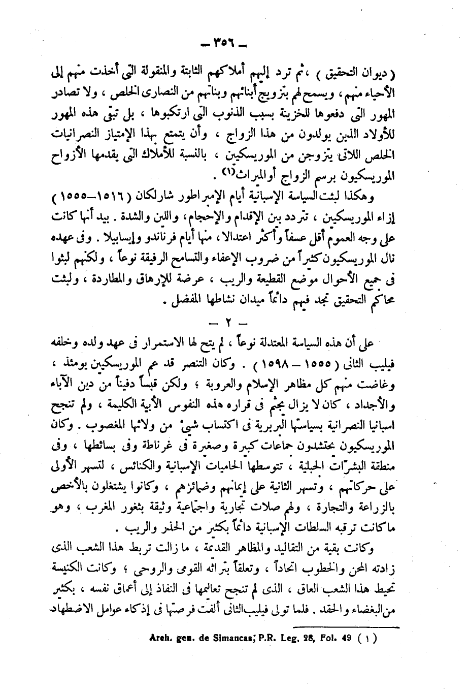 (ديوان التحقيق)، ثم ترد إليهم أملاكهم الثابتة والمنقولة التى أخذت منهم إلى الأحياء منهم، ويسمح لهم بتزويج أبنائهم وبناتهم من النصارى الخلص، ولا تصادر المهور التى دفعوها للخزينة بسبب الذنوب التى ارتكبوها، بل تبقى هذه المهور للأولاد الذين يولدون من هذا الزواج، وأن يتمتع بهذا الإمتياز النصرانيات الخلص اللاتى يتزوجن من الموريسكيين، بالنسبة للأملاك التى يقدمها الأزواج الموريسكيون برسم الزواج أو الميراث (¬1).