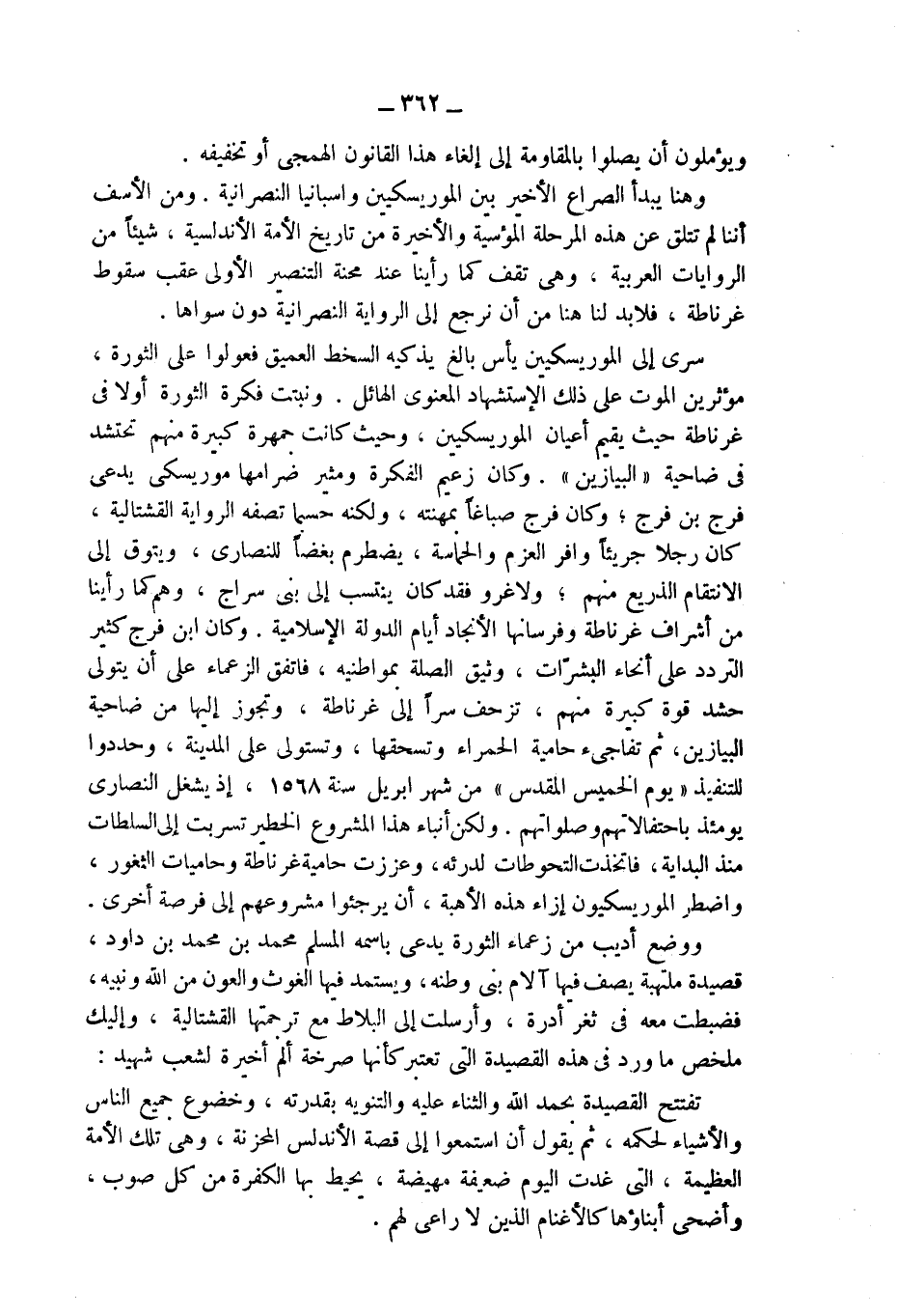 وهنا يبدأ الصراع الأخير بين الموريسكيين واسبانيا النصرانية. ومن الأسف أننا لم نتلق عن هذه المرحلة المؤسية والأخيرة من تاريخ الأمة الأندلسية، شيئاً من الروايات العربية، وهى تقف كما رأينا عند محنة التنصير الأولى عقب سقوط غرناطة، فلابد لنا هنا من أن نرجع إلى الرواية النصرانية دون سواها.