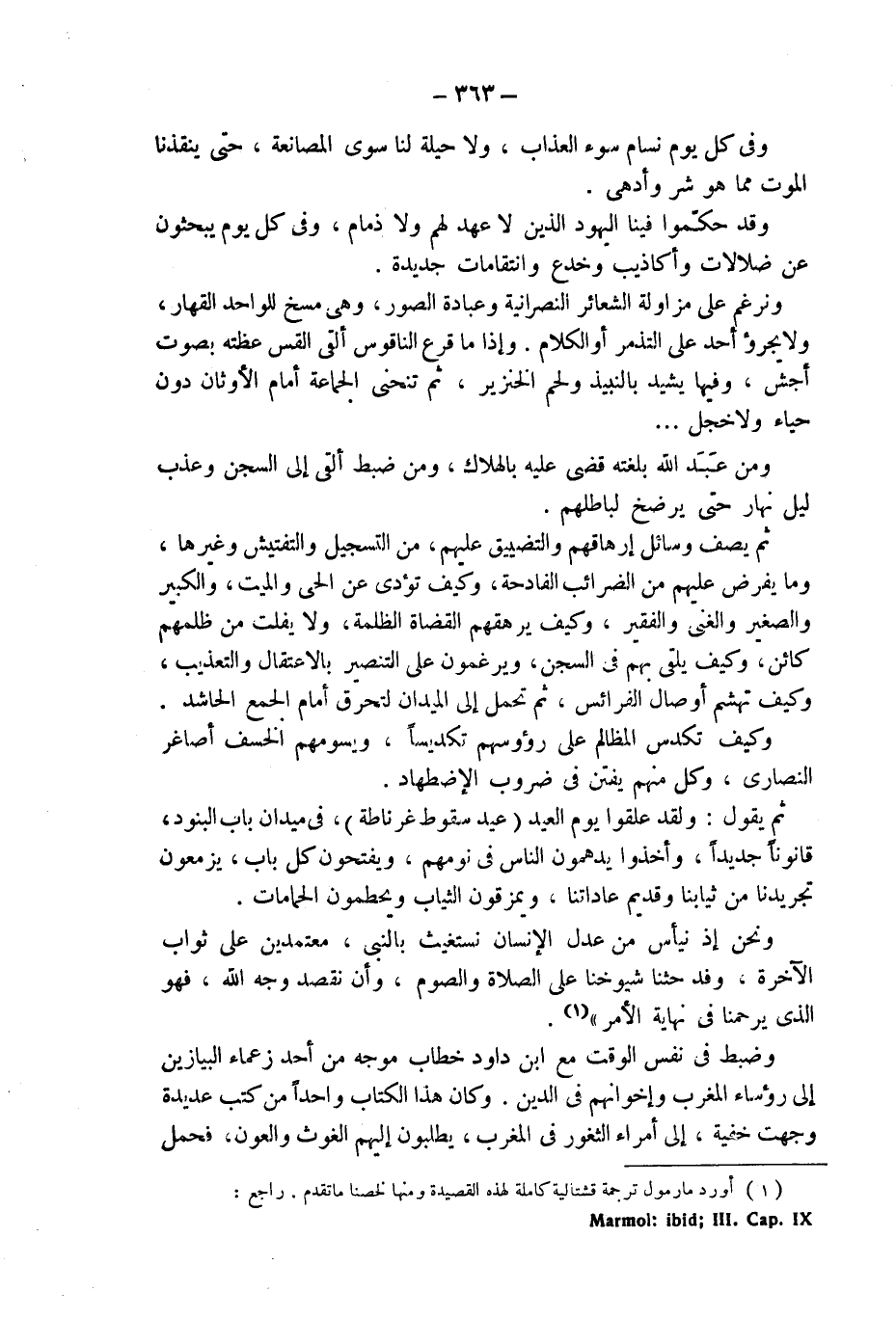 ونرغم على مزاولة الشعائر النصرانية وعبادة الصور، وهى مسخ للواحد القهار، ولا يجرؤ أحد على التذمر أو الكلام. وإذا ما قرع الناقوس ألقى القس عظته بصوت أجش، وفيها يشيد بالنبيذ ولحم الخنزير، ثم تنحنى الجماعة أمام الأوثان دون حياء ولا خجل ...