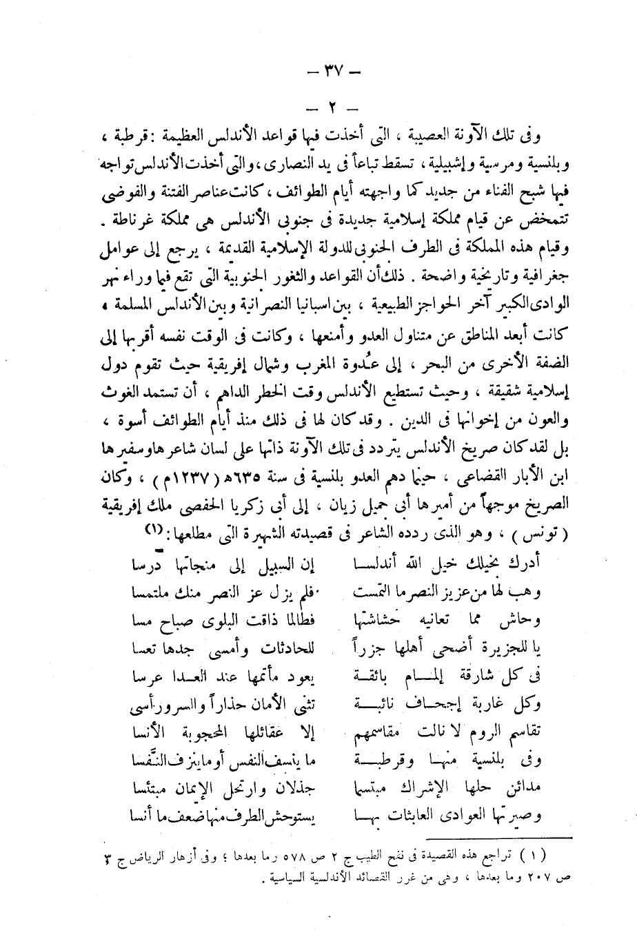 (¬1) تراجع هذه القصيدة في نفح الطيب ج 2 ص 578 وما بعدها؛ وفي أزهار الرياض ج 3 ص 207 وما بعدها، وهي من غرر القصائد الأندلسية السياسية.