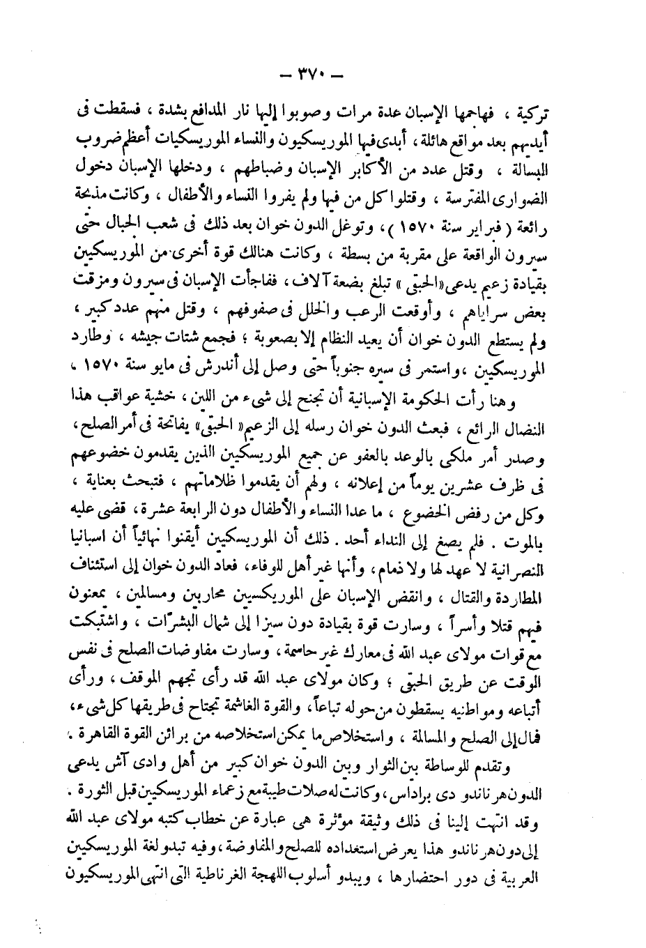 تركية، فهاجمها الإسبان عدة مرات وصوبوا إليها نار المدافع بشدة، فسقطت فى أيديهم بعد مواقع هائلة، أبدى فيها الموريسكيون والنساء الموريسكيات أعظم ضروب البسالة، وقتل عدد من الأكابر الإسبان وضباطهم، ودخلها الإسبان دخول الضوارى المفترسة، وقتلوا كل من فيها ولم يفروا من النساء والأطفال، وكانت مذبحة رائعة (فبراير سنة 1570)، وتوغل الدون خوان بعد ذلك فى شعب الجبال حتى سيرون الواقعة على مقربة من بسطة، وكانت هنالك قوة أخرى من الموريسكيين بقيادة زعيم يدعى"الحبقى" تبلغ بضعة آلاف، ففاجأت الإسبان فى سيرون ومزقت بعض سراياهم، وأوقعت الرعب والخلل فى صفوفهم، وقتل منهم عدد كبير، ولم يستطع الدون خوان أن يعيد النظام إلا بصعوبة؛ فجمع شتات جيشه، وطارد الموريسكيين، واستمر فى سيره جنوباً حتى وصل إلى أندرش فى مايو سنة 1570، وهنا رأت الحكومة الإسبانية أن تجنح إلى شىء من اللين، خشية عواقب هذا النضال الرائع، فبعث الدون خوان رسله إلى الزعيم "الحبقى" يفاتحه فى أمر الصلح، وصدر أمر ملكى بالوعد بالعفو عن جميع الموريسكيين الذين يقدمون خضوعهم فى ظرف عشرين يوماً من إعلانه، ولهم أن يقدموا ظلاماتهم، فتبحث بعناية، وكل من رفض الخضوع، ما عدا النساء والأطفال دون الرابعة عشرة، قضى عليه بالموت. فلم يصغ إلى النداء أحد. ذلك أن الموريسكيين أيقنوا نهائياً أن اسبانيا النصرانية لا عهد لها ولا ذمام، وأنها غير أهل للوفاء، فعاد الدون خوان إلى استئناف المطاردة والقتال، وانقض الإسبان على الموريسكيين محاربين ومسالمين، يمعنون فيهم قتلا وأسراً، وسارت قوة بقيادة دون سيزا إلى شمال البشرّات، واشتبكت مع قوات مولاى عبد الله فى معارك غير حاسمة، وسارت مفاوضات الصلح فى نفس الوقت عن طريق الحبقى، وكان مولاى عبد الله قد رأى تجهم الموقف، ورأى أتباعه ومواطنيه يسقطون من حوله تباعاً، والقوة الغاشمة تجتاح فى طريقها كل شىء، فمال إلى الصلح والمسالمة، واستخلاص ما يمكن استخلاصه من برائن القوة القاهرة.