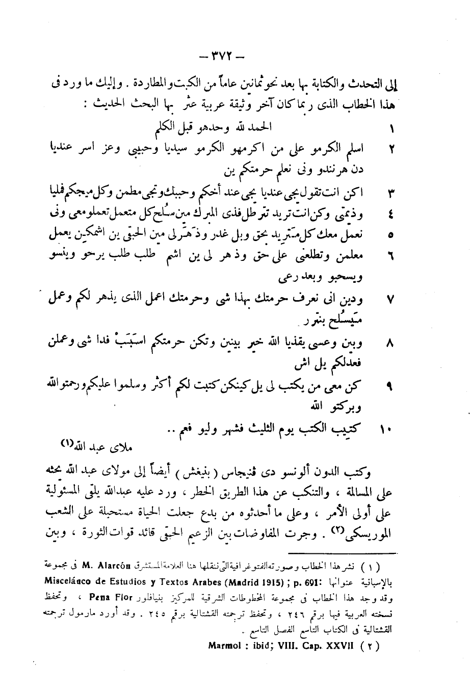 (¬1) نشر هذا الخطاب وصورته الفتوغرافية التى ننقلها هنا العلامة المستشرق M. Alarcon فى مجموعة بالإسبانية عنوانها: Miscelanco de Estudios y Textos Arabes (Madrid 1915) ; p. 691 وقد وجد هذا الخطاب فى مجموعة المخطوطات الشرقية للمركيز بنيافلور Pena Flor، وتحفظ نسخته العربية فيها برقم 246، وتحفظ ترجمته القشتالية برقم 245. وقد أورد مارمول ترجمته القشتالية فى الكتاب التاسع الفصل التاسع.