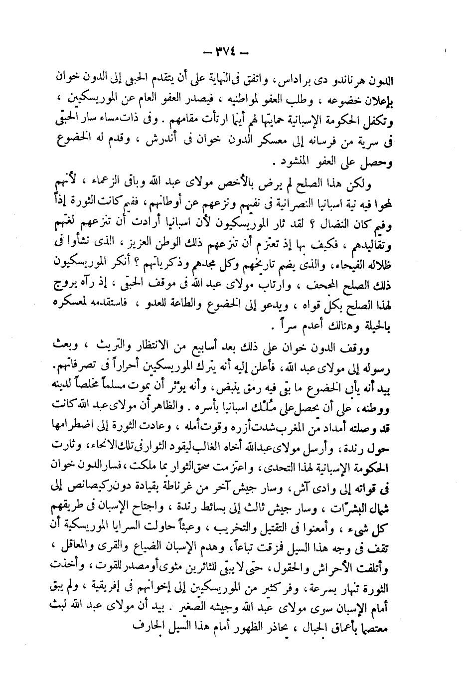 ووقف الدون خوان على ذلك بعد أسابيع من الانتظار والتريث، وبعث رسوله إلى مولاى عبد الله، فأعلن إليه أنه يترك الموريسكيين أحراراً فى تصرفاتهم. بيد أنه يأبى الخضوع ما بقى فيه رمق ينبض، وأنه يؤثر أن يموت مسلماً مخلصاً لدينه ووطنه، على أن يحصل على مُلْك اسبانيا بأسره. والظاهر أن مولاى عبد الله كانت قد وصلته أمداد من المغرب شدت أزره وقوّت أمله، وعادت الثورة إلى اضطرامها حول رندة، وأرسل مولاى عبد الله أخاه الغالب ليقود الثوار فى تلك الأنحاء، وثارت الحكومة الإسبانية لهذا التحدى، واعتزمت سحق الثوار بما ملكت، فسار الدون خوان فى قواته إلى وادى آش، وسار جيش آخر من غرناطة بقيادة دون ركيصانص إلى شمال البشرّات، وسار جيش ثالث إلى بسائط رندة، واجتاح الإسبان فى طريقهم كل شىء، وأمعنوا فى التقتيل والتخريب، وعبثاً حاولت السرايا الموريسكية أن تقف فى وجه هذا السيل فمزقت تباعاً، وهدم الإسبان الضياع والقرى والمعاقل، وأتلفت الأحراش والحقول، حتى لا يبقى للثائرين مثوى أو مصدر للقوت، وأخذت الثورة تنهار بسرعة، وفر كثير من الموريسكيين إلى إخوانهم فى إفريقية، ولم يبق أمام الإسبان سوى مولاى عبد الله وجيشه الصغير. بيد أن مولاى عبد الله لبث معتصما بأعماق الجبال، يحاذر الظهور أمام هذا السيل الجارف