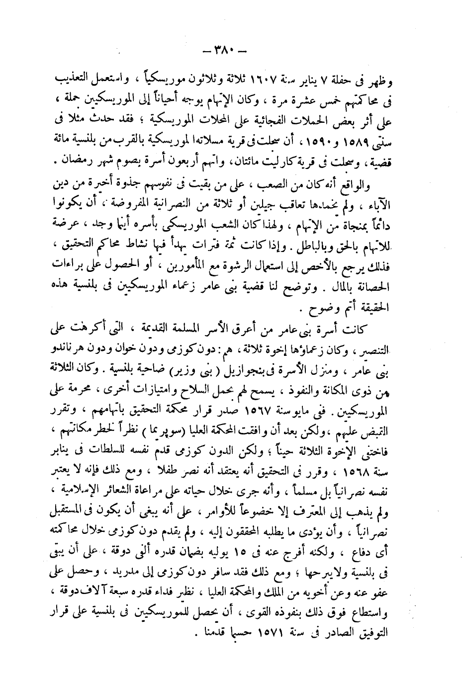 والواقع أنه كان من الصعب، على من بقيت فى نفوسهم جذوة أخيرة من دين الآباء، ولم يخمدها تعاقب جيلين أو ثلاثة من النصرانية المفروضة، أن يكونوا دائماً بمنجاة من الإتهام، ولهذا كان الشعب الموريسكى بأسره أينما وجد، عرضة للاتهام بالحق وبالباطل. وإذا كانت ثمة فترات يهدأ فيها نشاط محاكم التحقيق، فذلك يرجع بالأخص إلى استعمال الرشوة مع المأمورين، أو الحصول على براءات الحصانة بالمال. وتوضح لنا قضية بنى عامر زعماء الموريسكيين فى بلنسية هذه الحقيقة أتم وضوح.