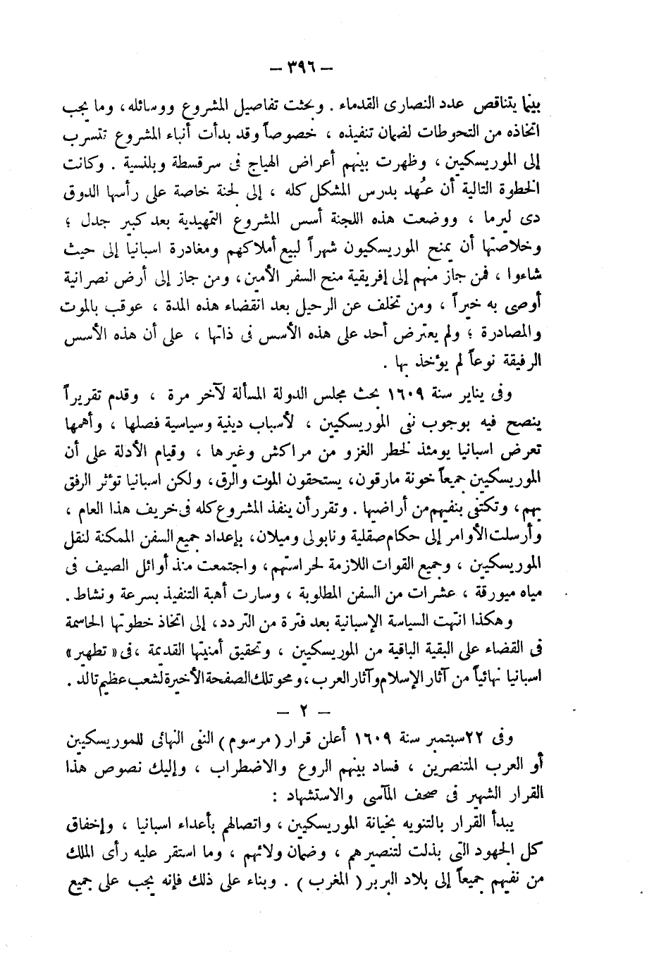 وفى 22 سبتمبر سسنة 1609 أعلن قرار (مرسوم) النفى النهائى للموريسكيين أو العرب المتنصرين، فساد بينهم الروع والاضطراب، وإليك نصوص هذا القرار الشهير فى صحف المآسى والاستشهاد:
