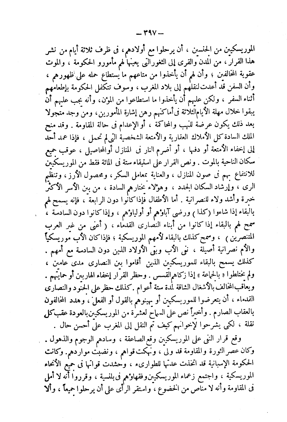الموريسكيين من الجنسين، أن يرحلوا مع أولادهم، فى ظرف ثلاثة أيام من نشر هذا القرار، من المدن والقرى إلى الثغور التى يعينها لهم مأمورو الحكومة، والموت عقوبة المخالفين؛ وأن لهم أن يأخذوا من متاعهم ما يستطاع حمله على ظهورهم، وأن السفن قد أعدت لنقلهم إلى بلاد المغرب، وسوف تتكفل الحكومة بإطعامهم أثناء السفر، ولكن عليهم أن يأخذوا ما استطاعوا من المؤن، وأنه يجب عليهم أن يبقوا خلال مهلة الأيام الثلاثة فى أماكنهم رهن إشارة المأمورين، ومن وجد متجولا بعد ذلك يكون عرضة للنهب والمحاكمة، أو الإعدام فى حالة المقاومة. وقد منح الملك السادة كل الأملاك العقارية والأمتعة الشخصية التى لم تحمل، فإذا عمد أحد إلى إخفاء الأمتعة أو دفنها، أو أضرم النار فى المنازل أو المحاصيل، عوقب جميع سكان الناحية بالموت. ونص القرار على استبقاء ستة فى المائة فقط من الموريسكيين للانتفاع بهم فى صون المنازل، والعناية بمعامل السكر، ومحصول الأرز، وتنظيم الرى، وإرشاد السكان الجدد، وهؤلاء يختارهم السادة، من بين الأسر الأكثر خبرة وأشد ولاء للنصرانية. أما الأطفال فإذا كانوا دون الرابعة، فإنه يسمح لهم بالبقاء إذا شاءوا (كذا) ورضى آباؤهم أو أولياؤهم، وإذا كانوا دون السادسة، سمح لهم بالبقاء إذا كانوا من أبناء النصارى القدماء، (أعنى من غير العرب المتنصرين)، وسمح كذلك بالبقاء لأمهم الموريسكية؛ فإذا كان الأب موريسكياً والأم نصرانية أصيلة، نفى الأب وبقى الأولاد الذين دون السادسة مع أمهم.