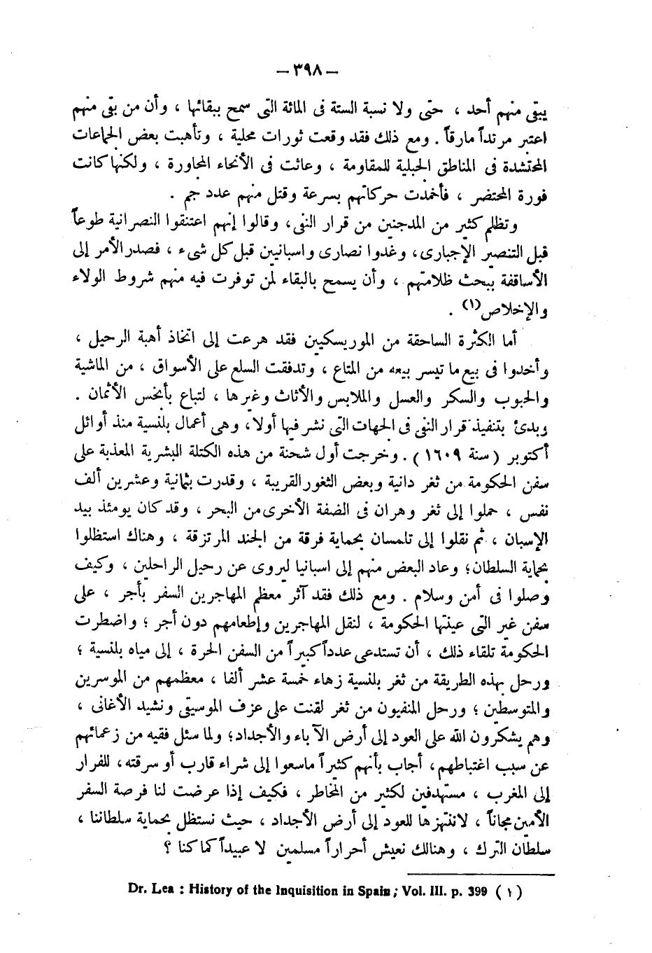 يبقى منهم أحد، حتى ولا نسبة الستة فى المائة التى سمح ببقائها، وأن من بقى منهم اعتبر مرتداً مارقاً. ومع ذلك فقد وقعت ثورات محلية، وتأهبت بعض الجماعات المحتشدة فى المناطق الجبلية للمقاومة، وعاثت فى الأنحاء المجاورة، ولكنها كانت فورة المحتضر، فأخمدت حركاتهم بسرعة وقتل منهم عدد جم.
