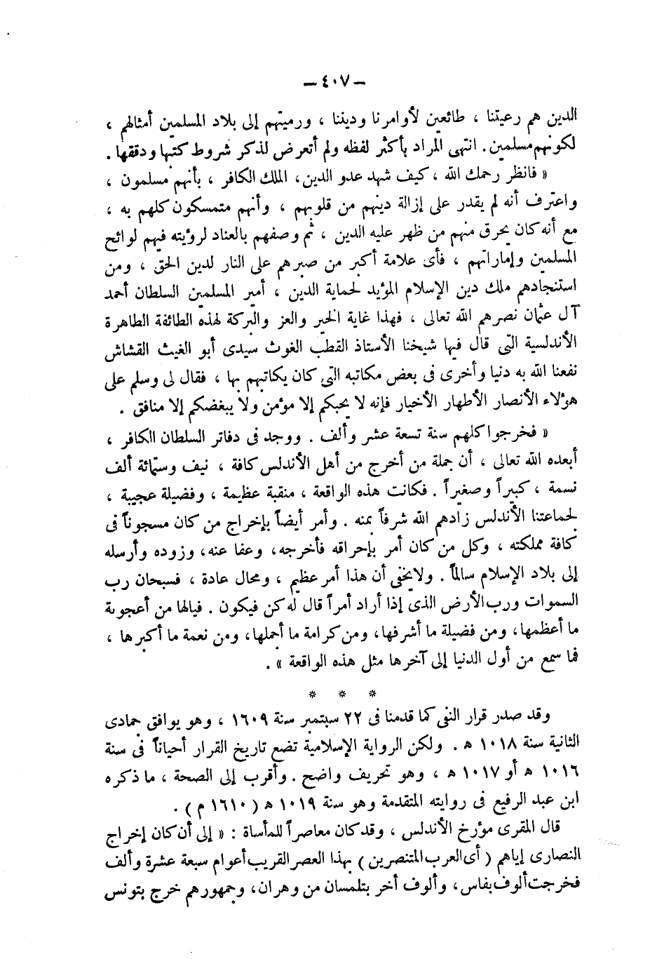 " فخرجوا كلهم سنة تسعة عشر وألف. ووجد فى دفاتر السلطان الكافر، أبعده الله تعالى، أن جملة من أخرج من أهل الأندلس كافة، نيف وستمائة ألف نسمة، كبيراً وصغيراً. فكانت هذه الواقعة، منقبة عظيمة، وفضيلة عجيبة، لجماعتنا الأندلس زادهم الله شرفاً بمنه. وأمر أيضاً بإخراج من كان مسجوناً فى كافة مملكته، وكل من كان أمر بإحراقه فأخرجه، وعفا عنه، وزوده وأرسله إلى بلاد الإسلام سالماً. ولا يخفى أن هذا أمر عظيم، ومحال عادة، فسبحان رب السموات ورب الأرض الذى إذا أراد أمراً قال له كن فيكون. فيالها من أعجوبة ما أعظمها، ومن فضيلة ما أشرفها، ومن كرامة ما أجملها، ومن نعمة ما أكبرها، فما سمع من أول الدنيا إلى آخرها مثل هذه الواقعة".