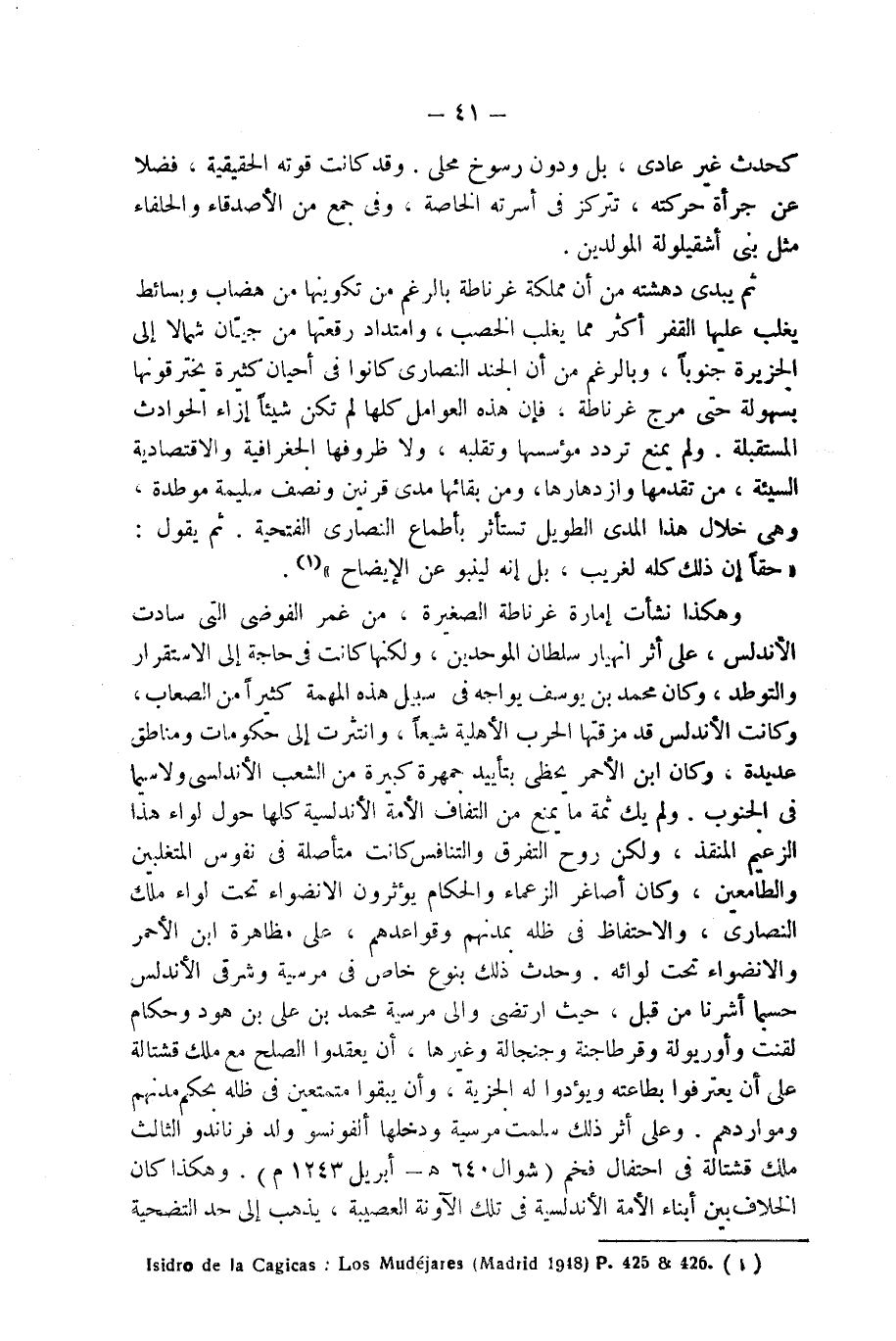ثم يبدى دهشته من أن مملكة غرناطة بالرغم من تكوينها من هضاب وبسائط يغلب عليها القفر أكثر مما يغلب الخصب، وامتداد رقعتها من جيّان شمالا إلى الجزيرة جنوباً، وبالرغم من أن الجند النصارى كانوا في أحيان كثيرة يخترقونها يسهولة حتى مرج غرناطة، فإن هذه العوامل كلها لم تكن شيئاً إزاء الحوادث المستقبلة. ولم يمنع تردد مؤسسها وتقلبه، ولا ظروفها الجغرافية والاقتصادية السيئة، من تقدمها وازدهارها، ومن بقائها مدى قرنين ونصف سليمة موطدة، وهي خلال هذا المدى الطويل تستأثر بأطماع النصارى الفتحية. ثم يقول: "حقاً إن ذلك كله لغريب، بل إنه لينبو عن الإيضاح" (¬1).