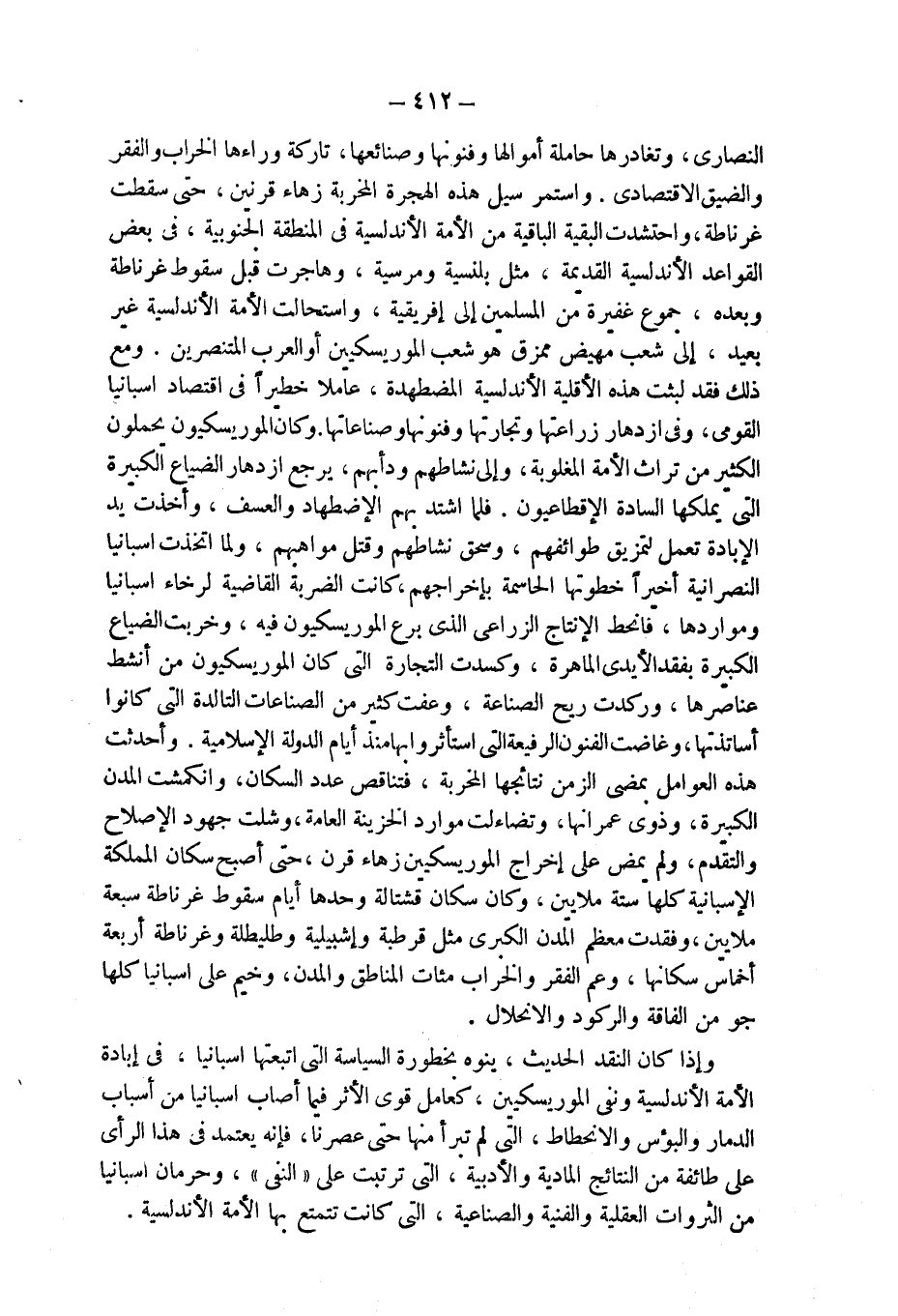 وإذا كان النقد الحديث، ينوه بخطورة السياسة التى اتبعتها اسبانيا، فى إبادة الأمة الأندلسية ونفى الموريسكيين، كعامل قوى الأثر فيما أصاب اسبانيا من أسباب الدمار والبؤس والانحطاط، التى لم تبرأ منها حتى عصرنا، فإنه يعتمد فى هذا الرأى على طائفة من النتائج المادية والأدبية، التى ترتبت على "النفى"، وحرمان اسبانيا من الثروات العقلية والفنية والصناعية، التى كانت تتمتع بها الأمة الأندلسية